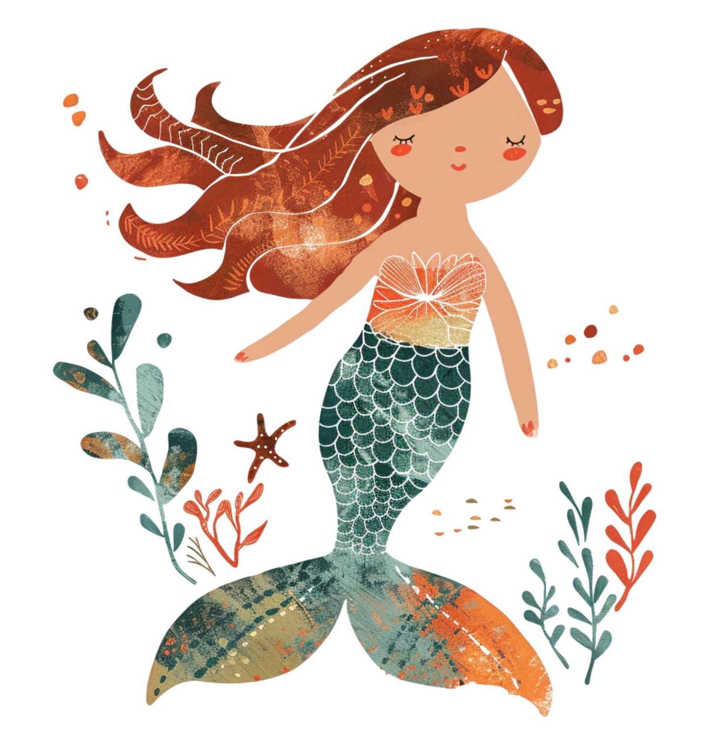 Pánské tričko Mořská Panna. Kouzelná ilustrace zachycuje něžnou mořská panna, která se ladně vznáší v prostředí moře a podmořských rostlin. Jemné barvy a hravé detaily vytvářejí pohádkovou atmosféru, kde se prolíná svět fantazie a přírody. Motiv propojuje prvky mořská panna, ryba a moře do harmonického celku, který působí uklidňujícím a snovým dojmem.