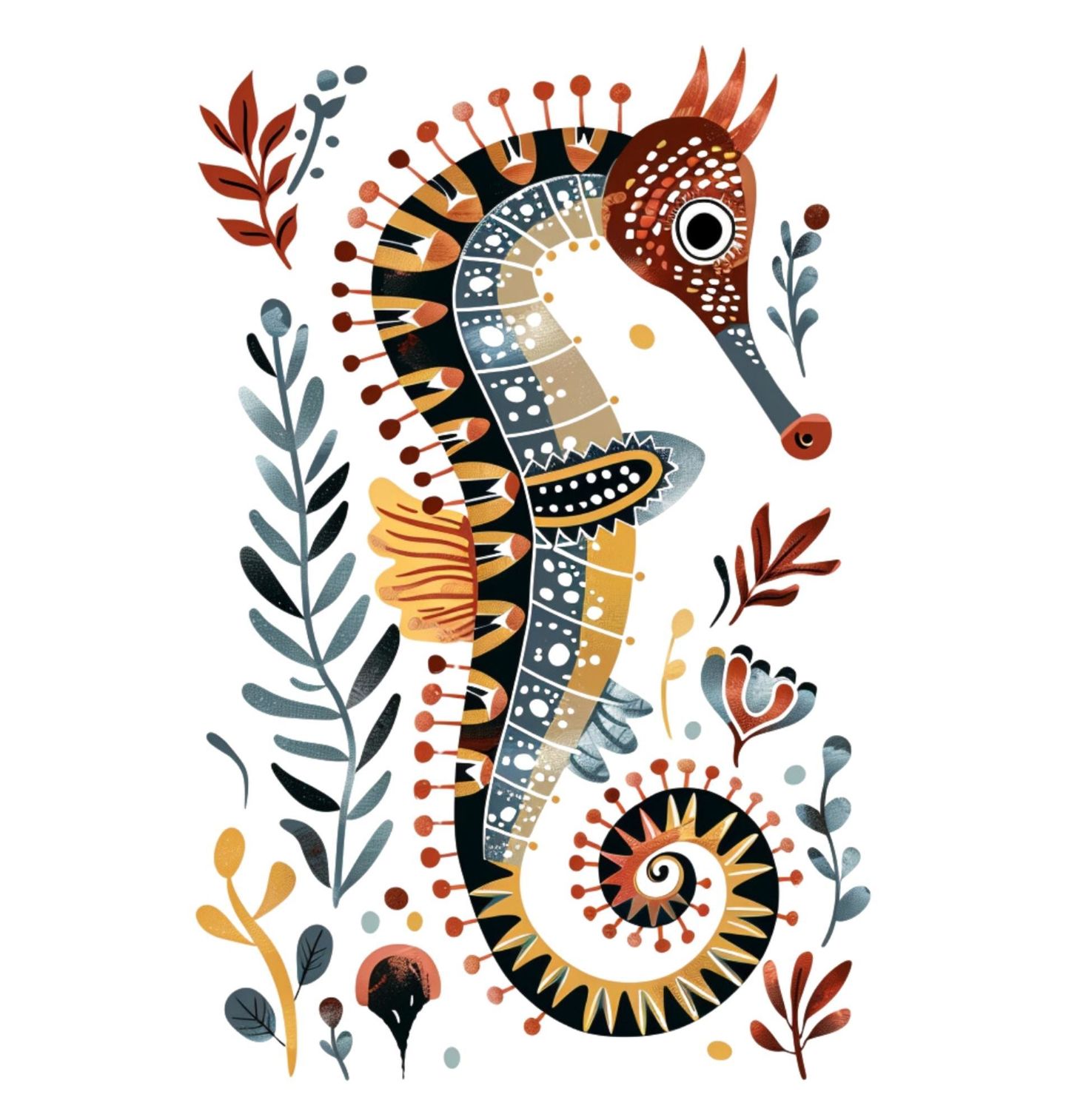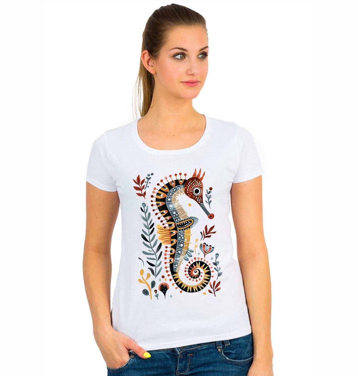 Dámské tričko Mořský koník. Originální ilustrace zachycuje mořský koník obklopený jemnými rostlinnými motivy a hravými detaily inspirovanými světem pod vodou. Stylizované prvky a barevná harmonie propojují motiv mořský koník, ryby a moře do jedinečné kompozice plné fantazie. Tento design evokuje klid i tajemství oceánu a je ideální pro všechny, kdo milují mořskou přírodu, jemné ornamenty a moderní ilustraci.