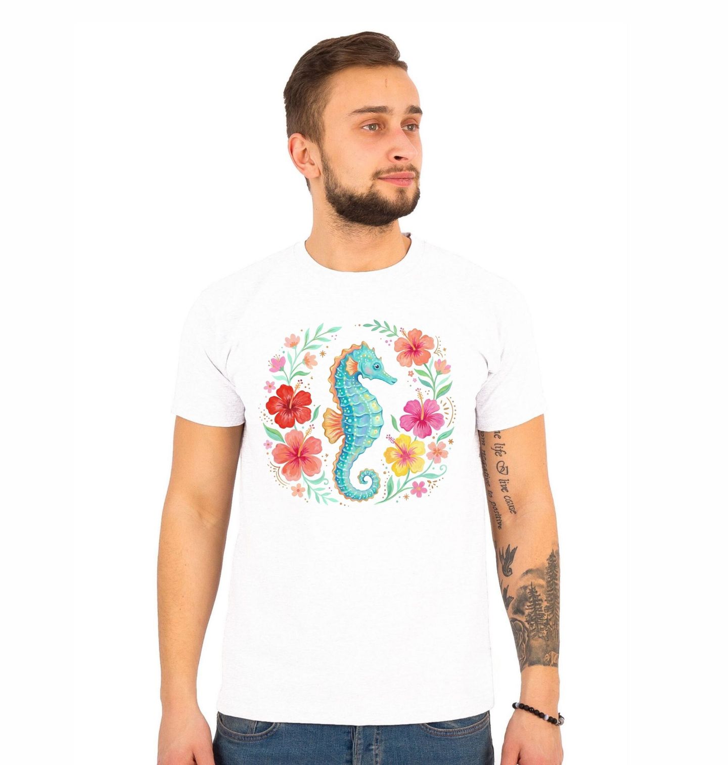 Pánské tričko Mořský Koník s Květinami. Elegantní ilustrace mořského koníka zdobeného barevnými květinami vytváří unikátní spojení přírody a oceánu. Detailní květinový vzor dodává designu jemnost a originalitu. Ideální pro každého, kdo miluje mořské motivy, květiny a estetický design.
