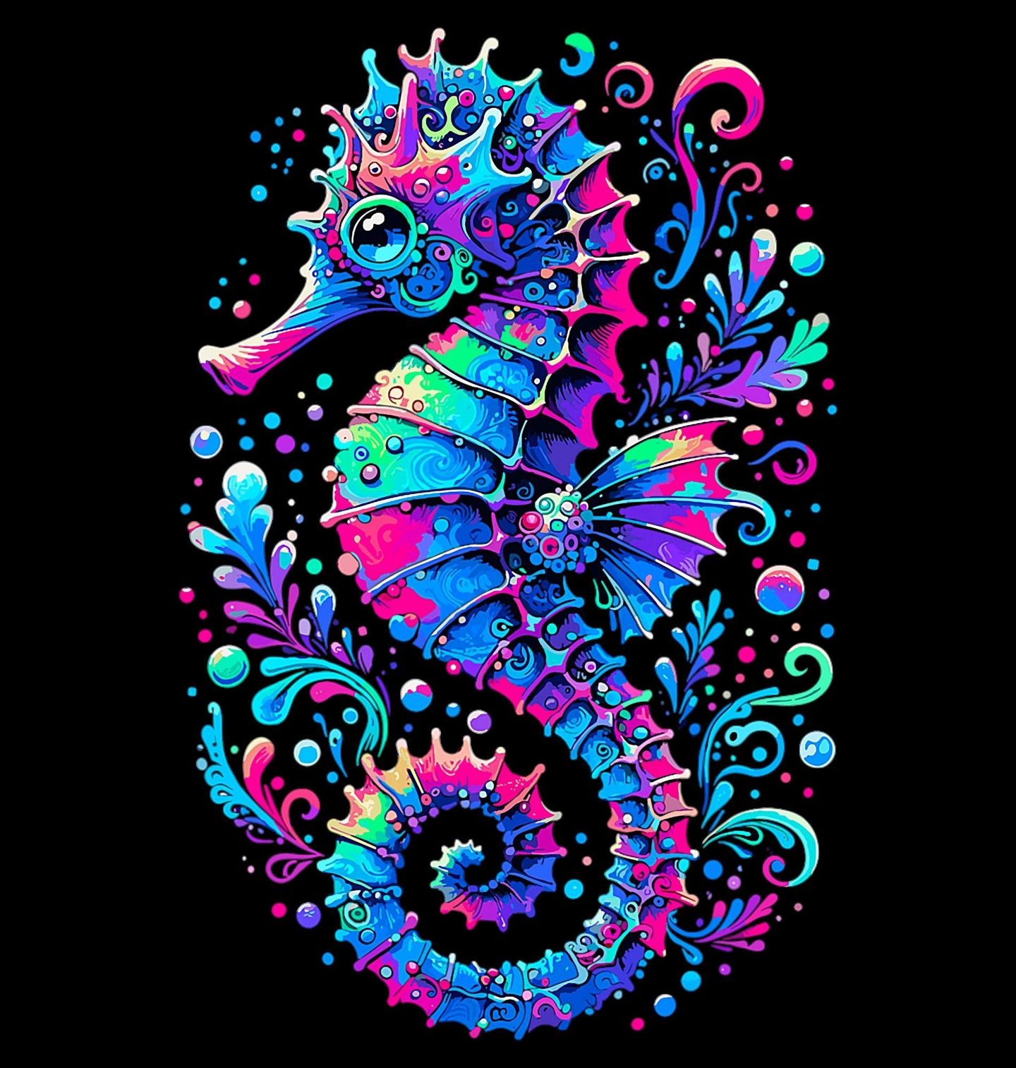 Pánská mikina Mořský Koník Seahorse. Okouzlující, zářivě barevný motiv mořského koníka, který jako by se právě vynořil z tajemných hlubin. Motiv zobrazuje koníka z moře obklopený ornamenty, bublinami a vodními ozdobami. Ideální pro milovníky přírody, oceánů, umění a všeho magického.