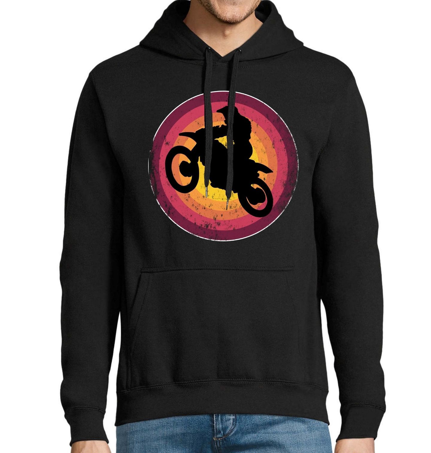 Pánská mikina Motokros Jezdec při Západu Slunce. Dynamický motiv zachycuje akční scénu, kde motokros jezdec na motorce skáče ve vzduchu na pozadí retro barev inspirovaných západem slunce. Tento design dokonale vystihuje energii, rychlost a adrenalin, které motokros přináší. Výrazná silueta a vintage styl dodávají motivu jedinečný charakter, který osloví každého fanouška offroad jízdy.