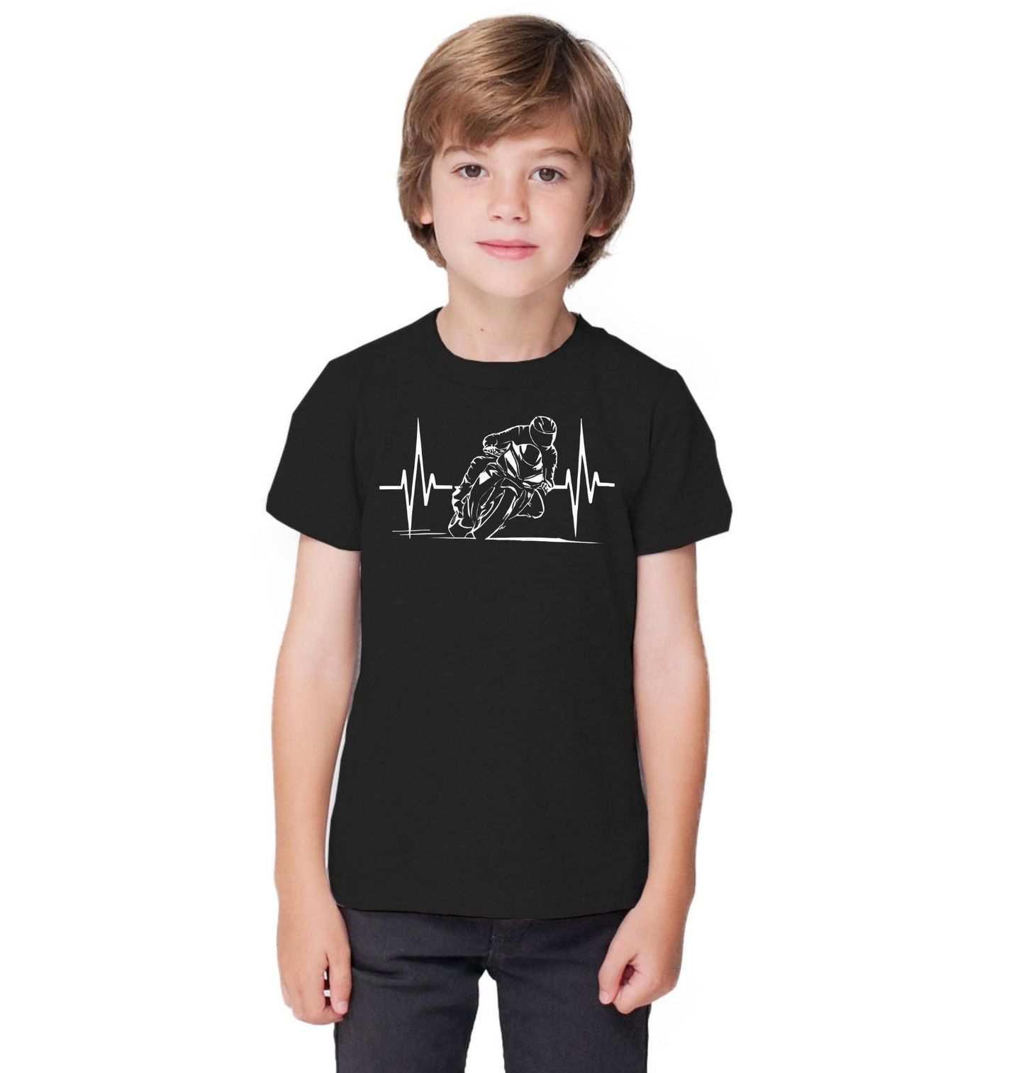 Dětské tričko Motorka Tep Života. Minimalistický design zachycuje siluetu motorky v pohybu doplněnou EKG křivkou, symbolizující vášeň pro jízdu. Tento motiv vyjadřuje, že motorka není jen dopravní prostředek, ale životní styl a adrenalin. Perfektní pro všechny motorkáře.