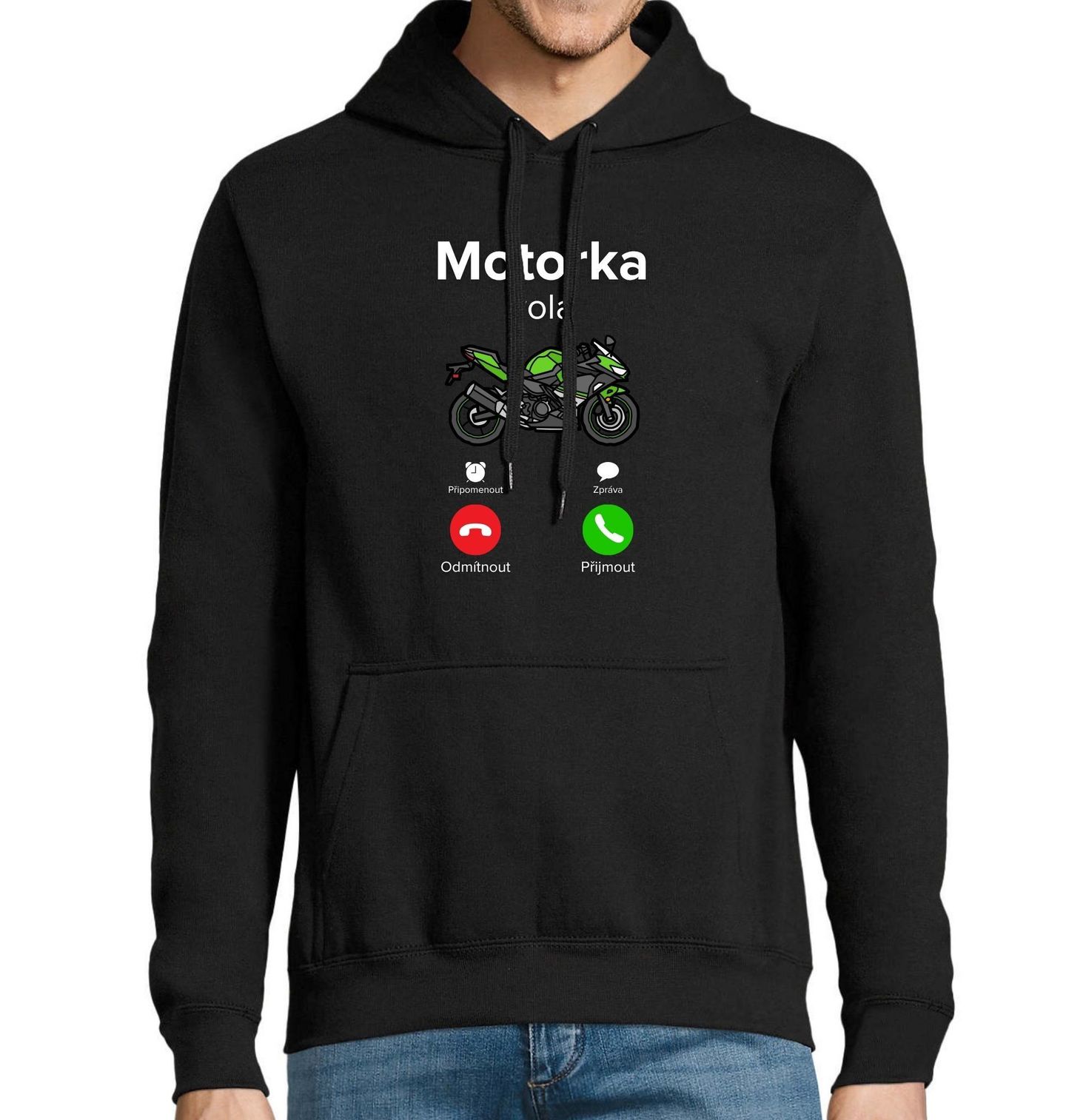 Pánská mikina Motorka volá Phone Call. Iphone zvoní, motorka volá, hovor se nepřijímá – nasedá se a jede. Tričko pro ty, kdo nečekají na signál, ale rovnou naskočí do sedla. Hovor nepřijímáš prstem, ale otočením klíčku. Ideální kousek pro všechny, kdo místo výmluv volí asfalt.