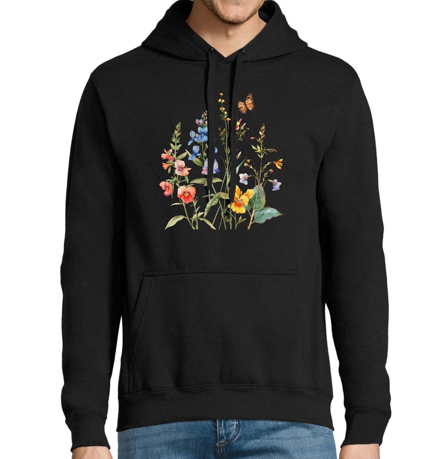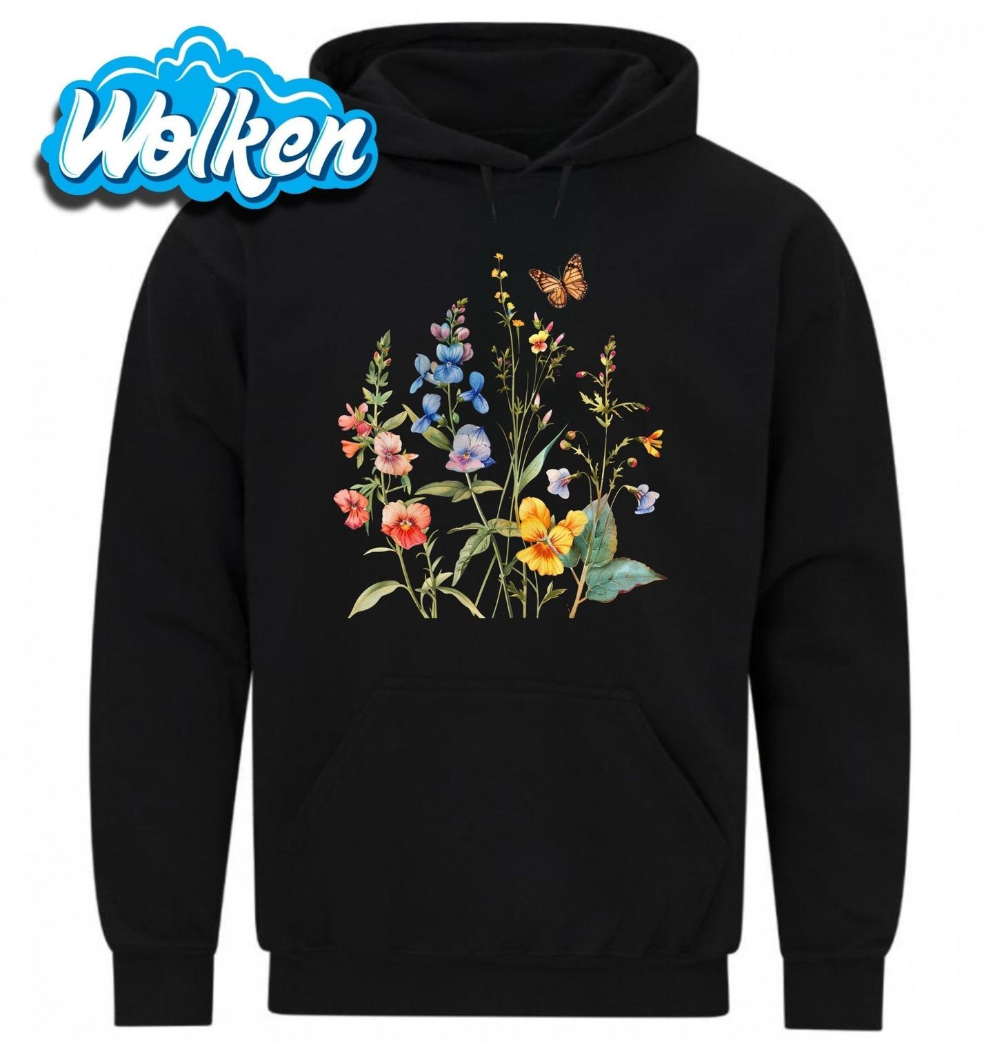 Pánská mikina Motýl Monarcha a Luční květiny. Různorodé luční květiny, jako jsou slézovec, violka, lnice, pupalka a divizna, které společně tvoří harmonickou a barevnou kompozici. Celý obraz dotváří motýl monarcha stěhovavý, symbol volnosti a přírodní elegance. Ideální pro milovníky divokých květin a motýlů.
