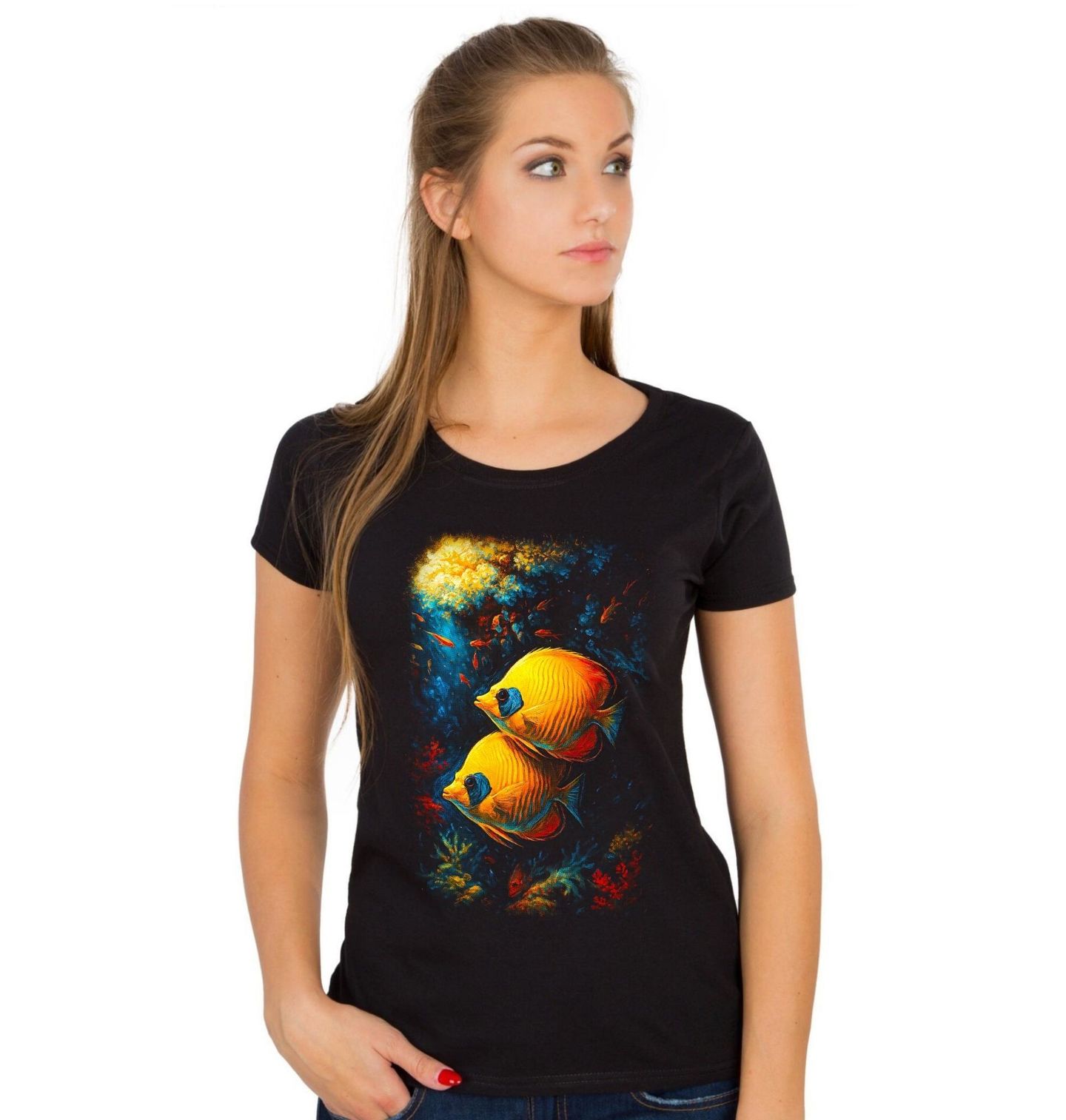 Dámské tričko Motýlek modrolící. Zobrazeným druhem je motýlek modrolící (Bluecheek butterflyfish), tropická mořská ryba typická pro Rudé moře. Motýlek je známý svým výskytem v párech, výrazným kontrastním zbarvením a vazbou na zdravé korálové prostředí. Právě takové ryby jsou symbolem oceánů, které každý zkušený rybář respektuje a obdivuje.