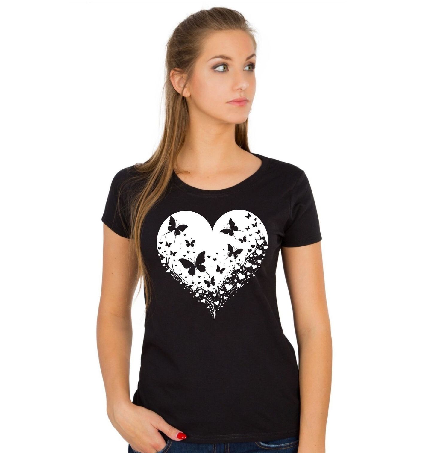 Dámské tričko Motýli v Srdci. Elegantní motiv, kde se prolíná srdce s něžnými siluetami, ve kterých dominuje motýl, vytváří harmonický a romantický design. Tento jedinečný vzor symbolizuje proměnu, svobodu a krásu života, zatímco tvar srdce dodává celému motivu hluboký význam lásky a emocí. Perfektní volba jako dárek pro milovanou osobu nebo jako osobní vyjádření radosti ze života.
