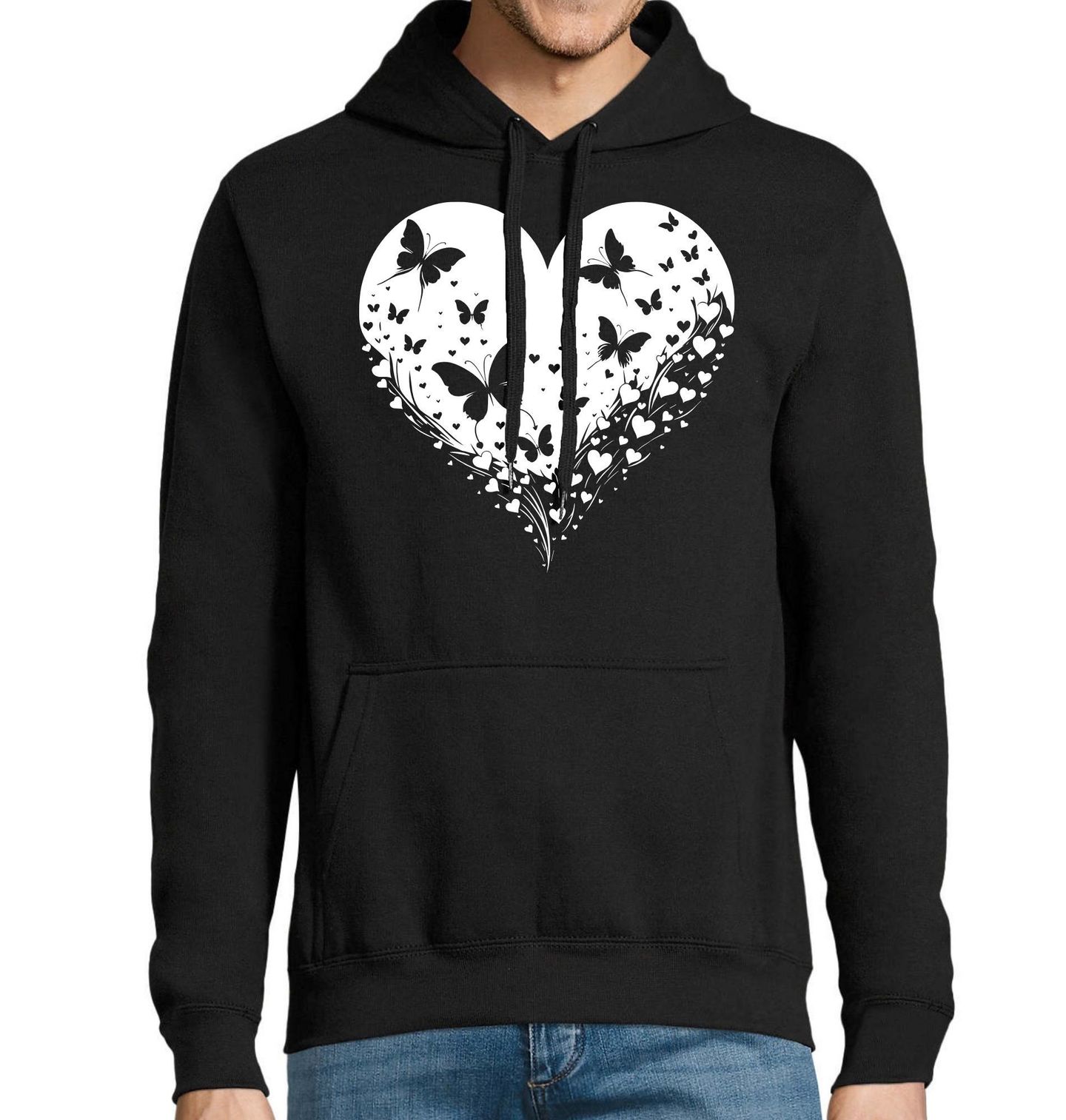 Pánská mikina Motýli v Srdci. Elegantní motiv, kde se prolíná srdce s něžnými siluetami, ve kterých dominuje motýl, vytváří harmonický a romantický design. Tento jedinečný vzor symbolizuje proměnu, svobodu a krásu života, zatímco tvar srdce dodává celému motivu hluboký význam lásky a emocí. Perfektní volba jako dárek pro milovanou osobu nebo jako osobní vyjádření radosti ze života.