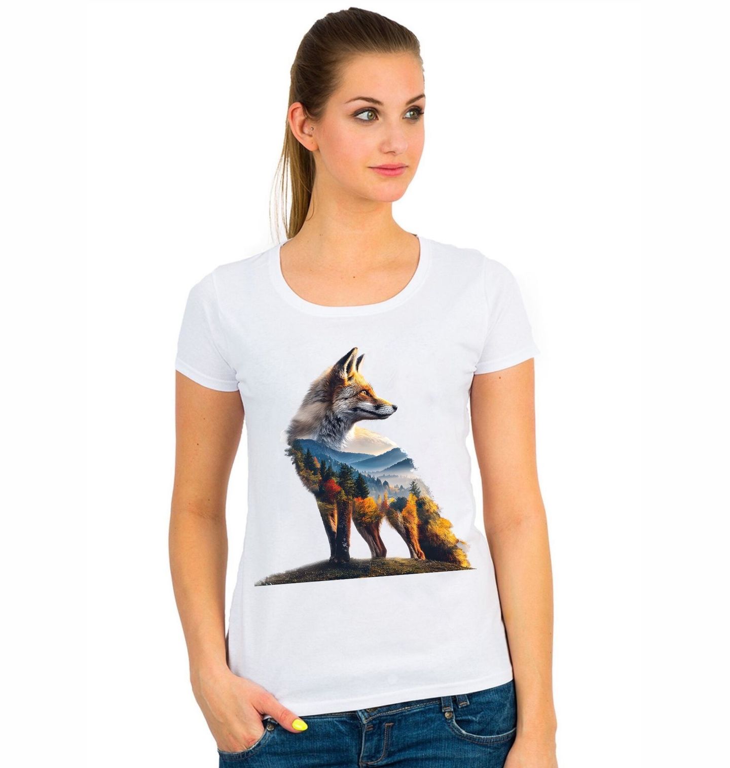 Dámské tričko Moudrá Liška v Krajině. Jedinečný motiv, který spojuje elegantní lišku s malebnou horskou scenérií, kde se prolíná krajina plná lesů, barev a mlhy. Tento design vystihuje klid, sílu i tajemství přírody a vytváří harmonický obraz, který osloví každého milovníka divoké krajiny, zvířat či dokonce i vášnivého lovce.