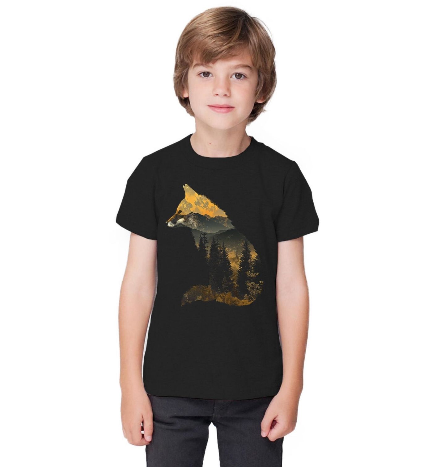 Dětské tričko Moudrá Liška z Hlubin Lesa. Tento jedinečný motiv spojuje majestátní siluetu zvířete a krásu krajiny – liška, v jejímž těle se skrývá celý les s horami, stromy a světlem zapadajícího slunce. Symbol propojení zvířecí duše a volné přírody.