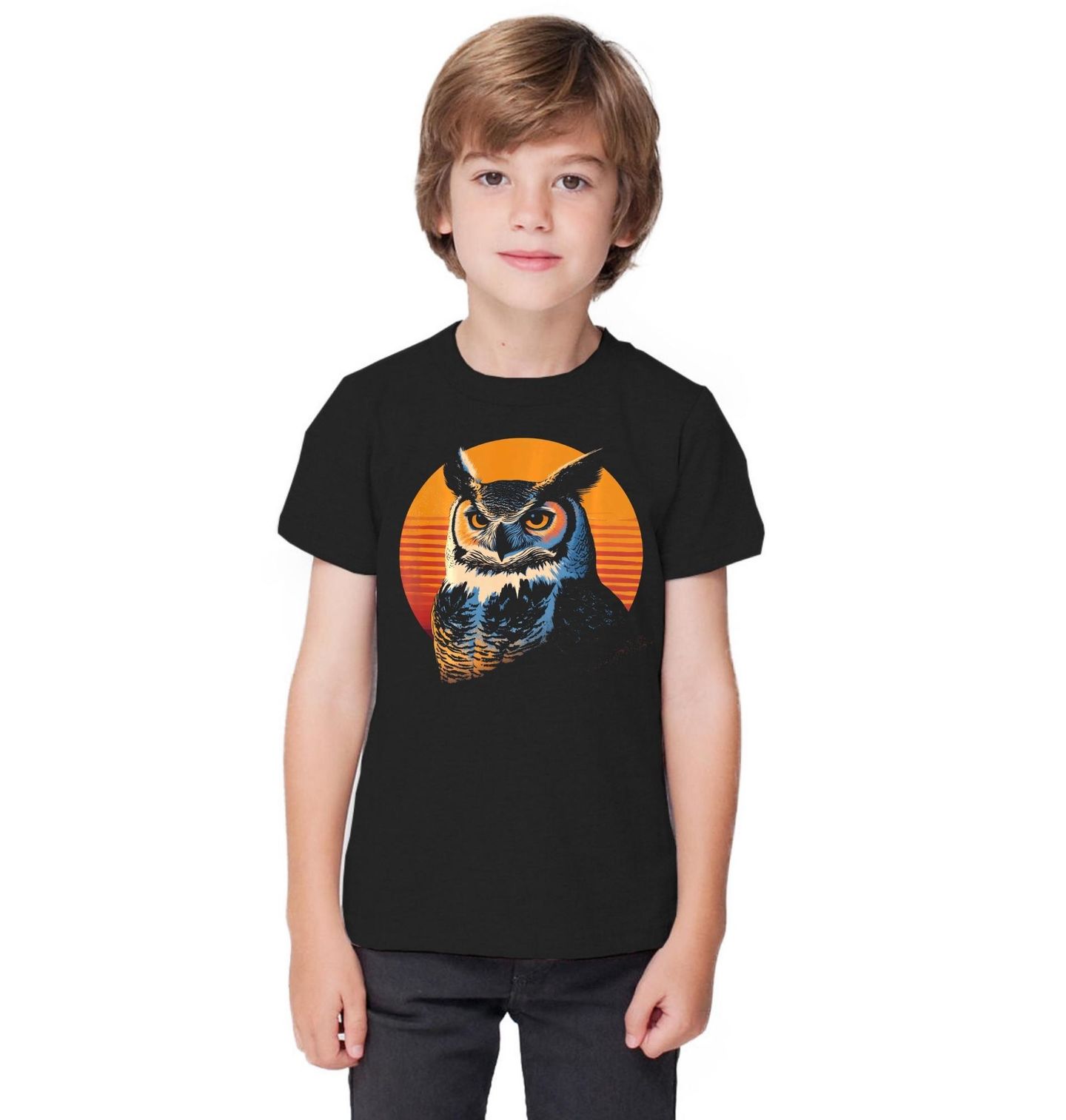 Dětské tričko Moudrá Sova. Elegantní design zachycující majestátní sovu před stylizovaným západem slunce v retro barvách. Tento design symbolizuje moudrost, klid a pozorovací schopnosti, které jsou typické pro sovy. Výrazné kontrasty a detailní kresba dodávají motivu jedinečný charakter vhodný pro milovníky přírody.