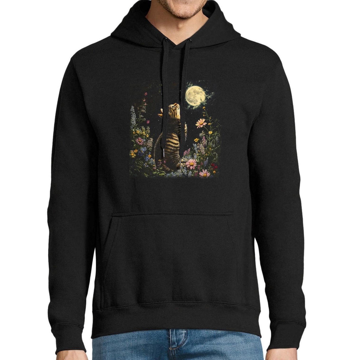 Pánská mikina Mourovatá kočka při Úplňku. Roztomilá mourovatá kočka (klasická evropská krátkosrstá) sedí v rozkvetlé zahradě plné barevných květin a zamilovaně hledí na zářivý měsíc. Ideální pro milovníky koček, přírody a tichých romantických chvilek pod hvězdami. Připrav se na mazlivý útěk do světa klidu, kde květiny voní a kočky sní o Měsíci.