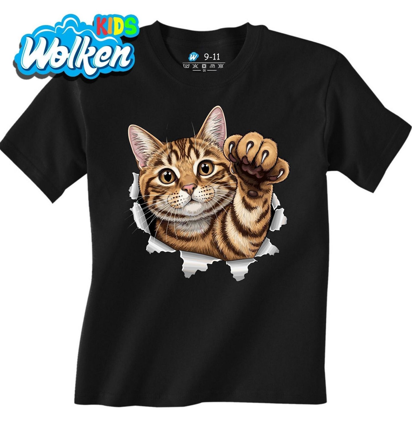 Dětské tričko Mourovatá Škrábající Kočka Tabby cat. Kočka v plné akci – tahle roztomilá, ale dravá šelma se dere skrz triko přímo ven! Iluze protržené látky a realistický detail packy s ostrými drápky dělají z tohoto motivu absolutní must-have pro každého kočkomilce.