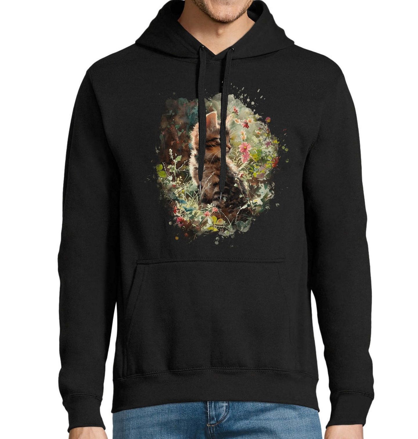Pánská mikina Mourovaté Kotě v Květinové Zahradě. Něžný akvarelový motiv zachycuje kočku, která tiše sedí uprostřed rozkvetlé zahrady. Jemné květiny kolem ní vytvářejí atmosféru klidu, jara a přirozené harmonie. Celá ilustrace působí lehce snově a evokuje okamžik, kdy se svět na chvíli zastaví a příroda promlouvá tichem.