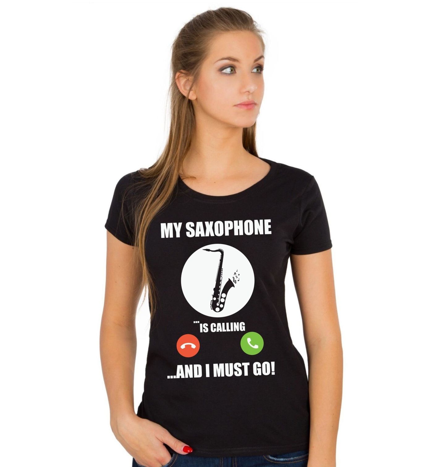 Dámské tričko Můj Saxofon Volá Phone Call. Vtipný a originální motiv pro všechny hudební nadšence. Obrázek zobrazuje příchozí hovor od saxofonu doplněný textem “MY SAXOPHONE IS CALLING… AND I MUST GO!” (v překladu „Můj saxofon volá… a já musím jít!“). Symbolika znázorňuje neodolatelné volání hudby, kterému nelze odolat.