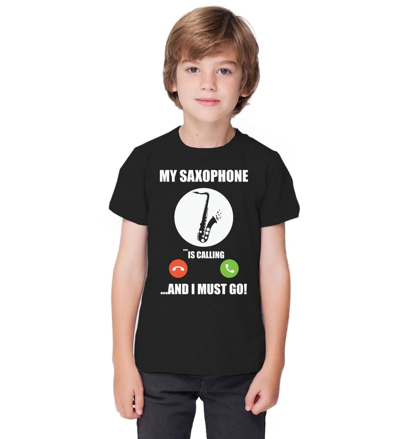 Dětské tričko Můj Saxofon Volá Phone Call. Vtipný a originální motiv pro všechny hudební nadšence. Obrázek zobrazuje příchozí hovor od saxofonu doplněný textem “MY SAXOPHONE IS CALLING… AND I MUST GO!” (v překladu „Můj saxofon volá… a já musím jít!“). Symbolika znázorňuje neodolatelné volání hudby, kterému nelze odolat.