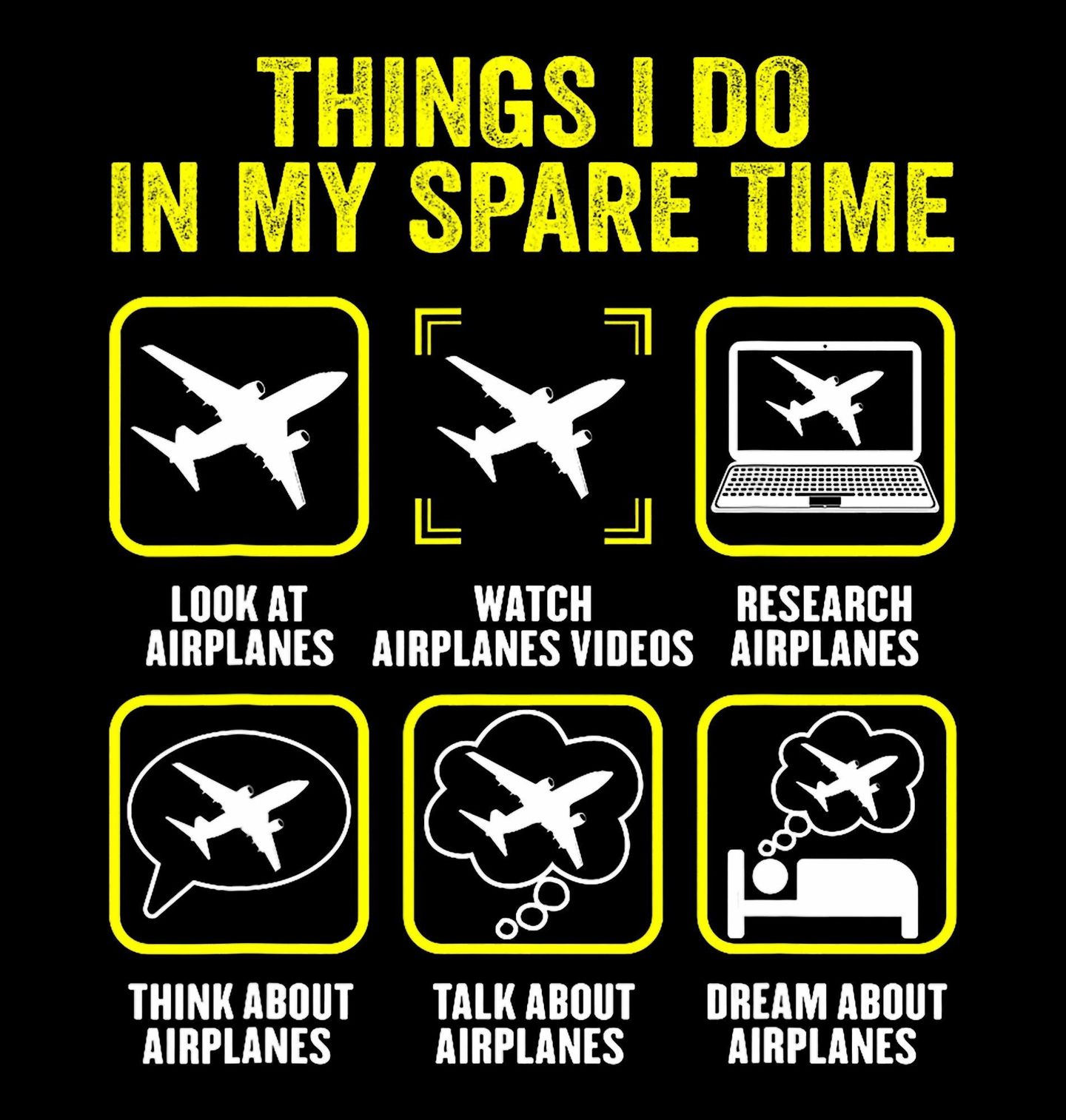 Dámské tričko Můj Svět Letadel. Zábavný motiv letadly obsahuje text „THINGS I DO IN MY SPARE TIME“, tedy „Co dělám ve volném čase“. Následují aktivity jako například „LOOK AT AIRPLANES“ (dívám se na letadla) či „WATCH AIRPLANE VIDEOS“ (sleduji videa letadel). Vhodný dárek pro všechny milovníky letadel.