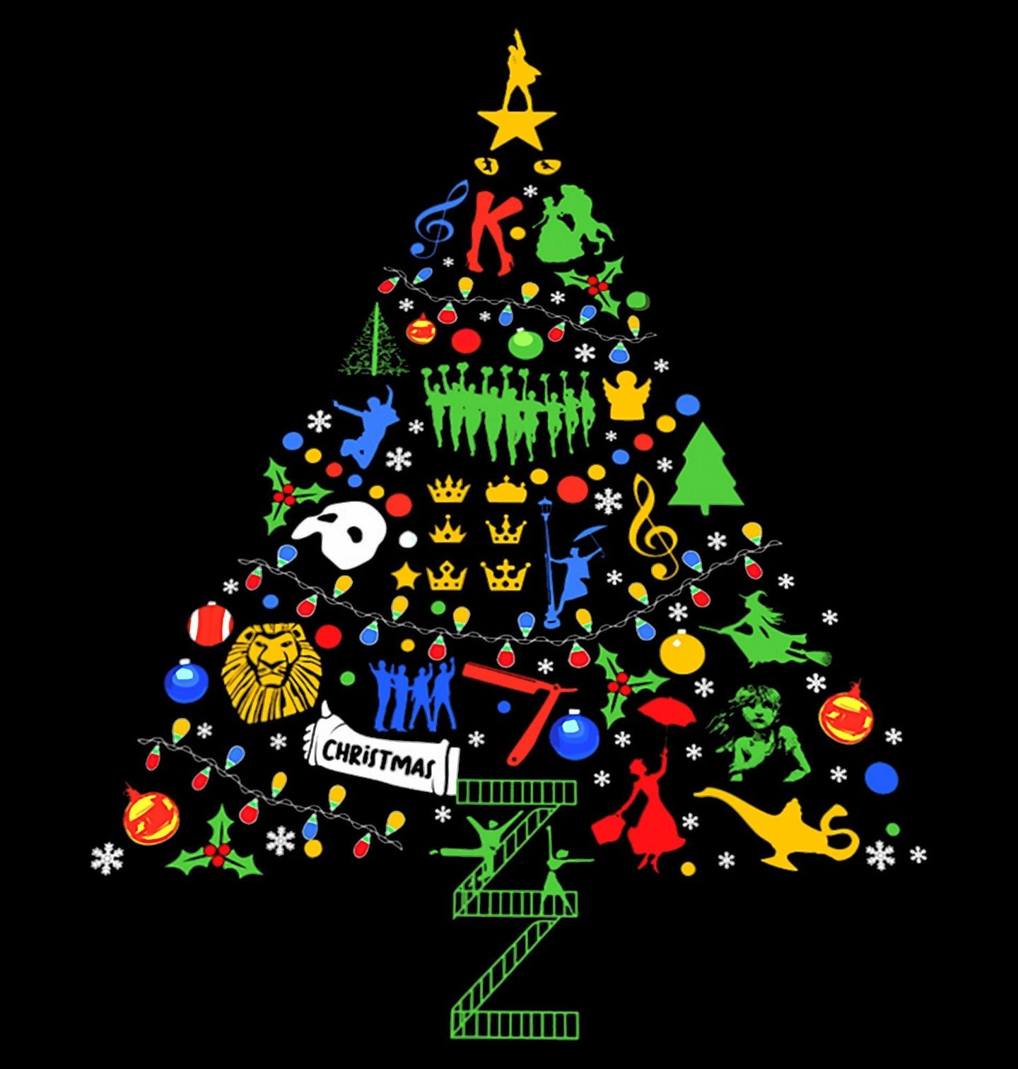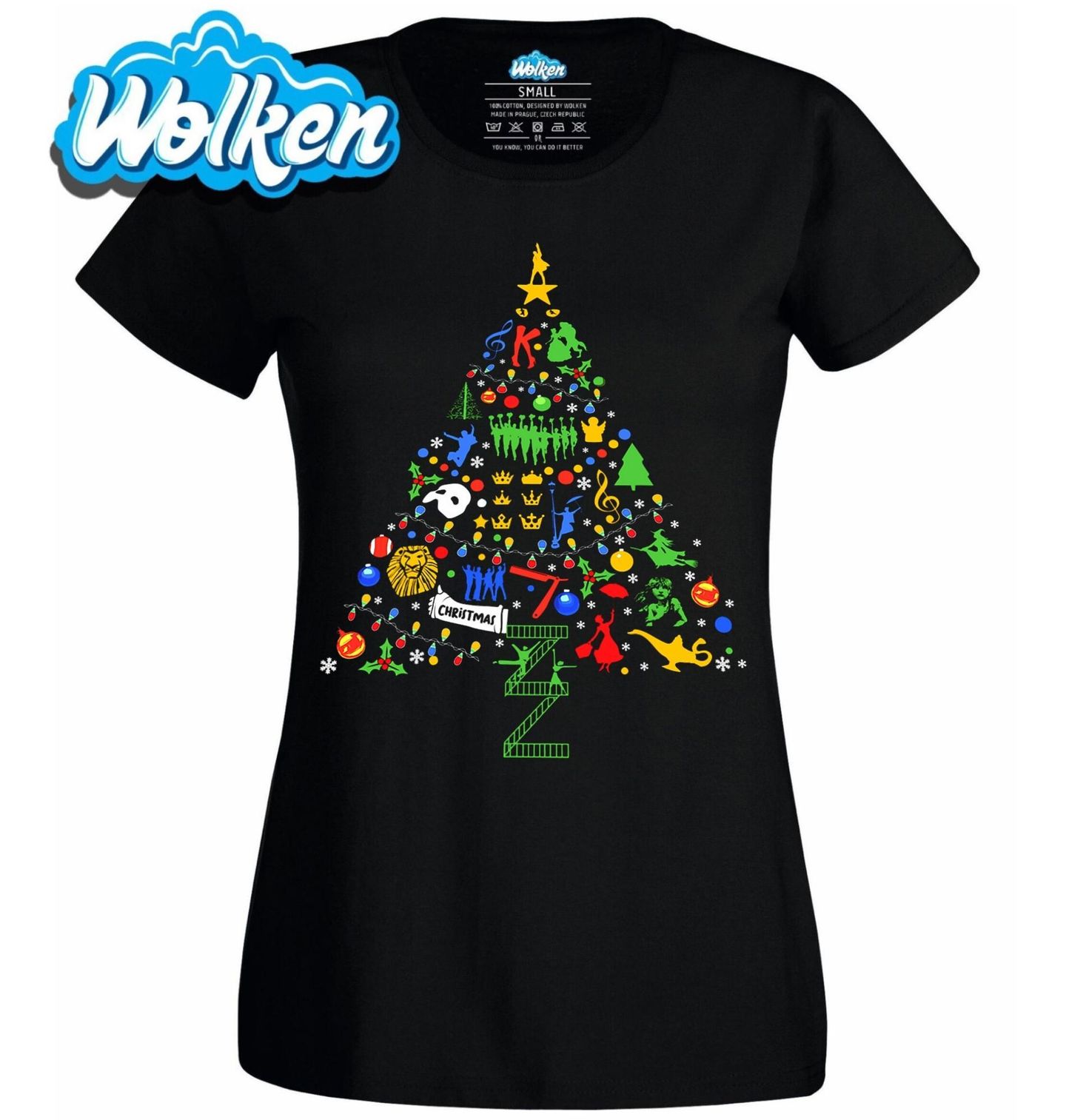 Dámské tričko Muzikálový Vánoční Stromek. Originální motiv na Vánoce, který potěší každého fanouška hudebního divadla. Tento vánoční strom je složený z ikonických prvků nejslavnějších muzikálů jako je Lví král, Fantom opery, Wicked, Les Misérables, Aladin či Mary Poppins.