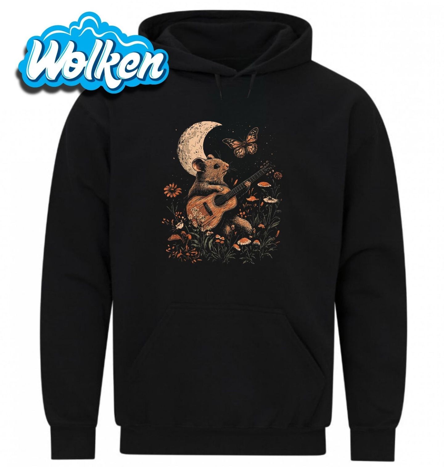 Pánská mikina Myší Píseň pod Měsícem. Roztomilý motiv s myší, která pod svitem měsíce hraje na kytaru uprostřed rozkvetlé louky. Ideální pro milovníky přírody, hudby a pohádkových ilustrací. Hledáte originální dárek? Tento design s motivem kytara, měsíc a myš je perfektní volbou!