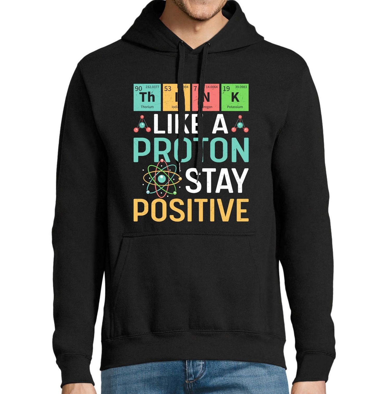 Pánská mikina Mysli jako Proton Think Like a Proton. Originální motiv inspirovaný vědou propojuje fyziku a chemii v hravém a motivujícím designu s anglickým textem „Think Like a Proton – Stay Positive“, což v překladu znamená „Mysli jako proton – zůstaň pozitivní.“ Barevné prvky připomínající periodickou tabulku a atom dodávají motivu jedinečný charakter, ideální pro každého, koho baví fyzika a chemie.