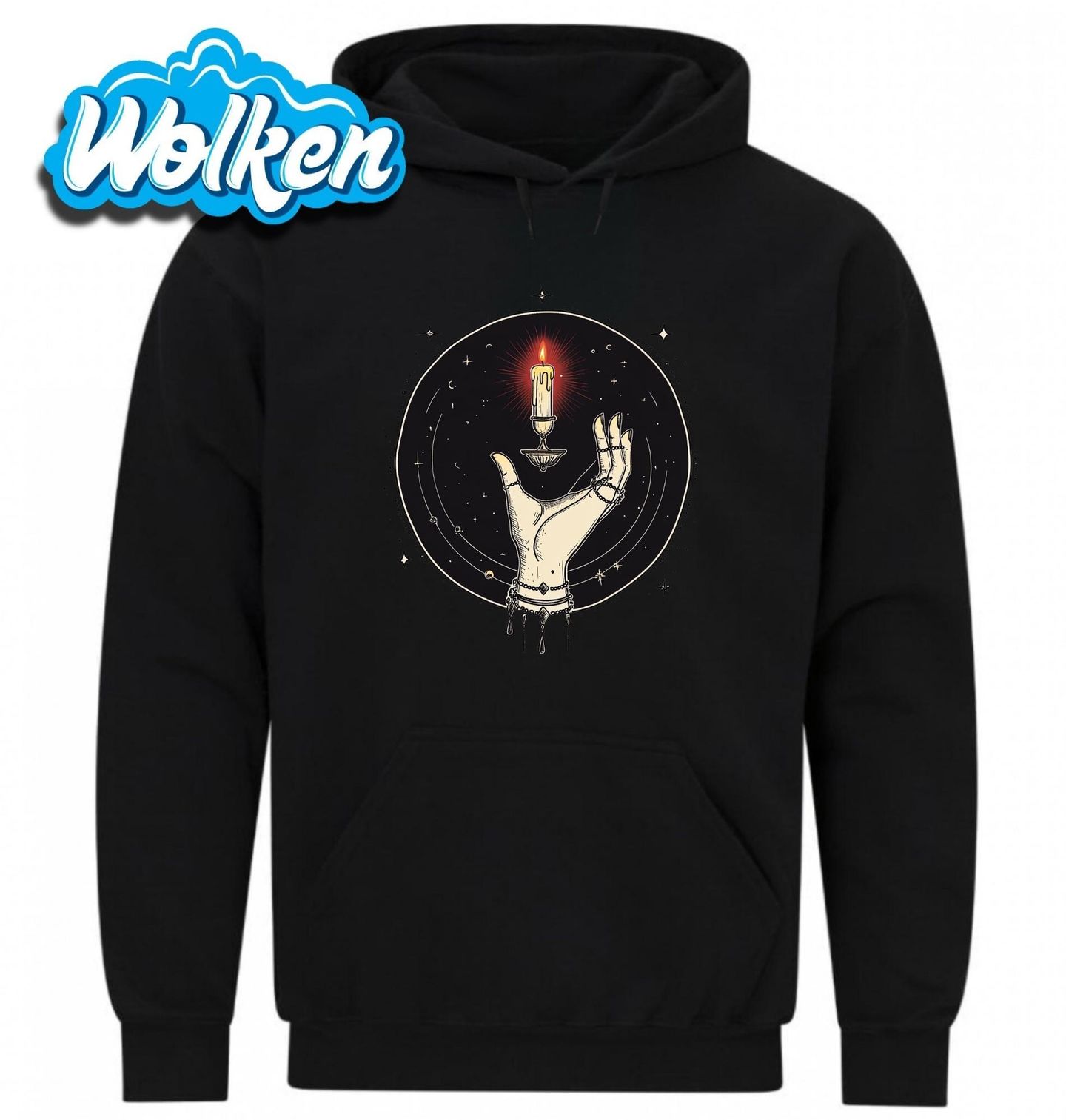 Pánská mikina Mystická Hořící Svíčka. Tajemná ruka zdobená šperky nese svícen a hořící svíčku, která září ve tmě vesmíru plného hvězd. Tento okultně laděný motiv symbolizuje vnitřní světlo, intuici a sílu ženské energie. Ideální pro milovníky magie, spiritualismu a mystiky.