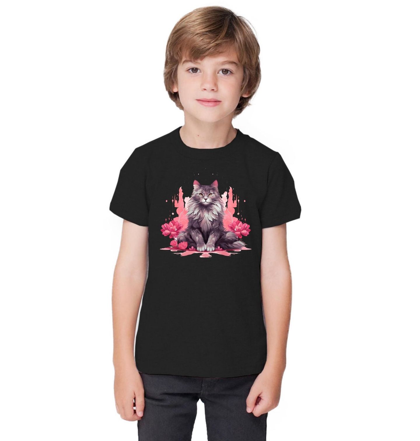 Dětské tričko Mystická Mainská Kočka mezi Květy. Elegantní a klidná kočka sedící mezi růžovými květy působí jako symbol harmonie, síly a tiché elegance. Tento motiv pravděpodobně zachycuje dlouhosrstou mainskou kočka, která vyzařuje sebejistotu a jemnou mystiku. Kontrast tmavého pozadí a růžových akcentů dává ilustraci hloubku a výraznou vizuální přitažlivost.