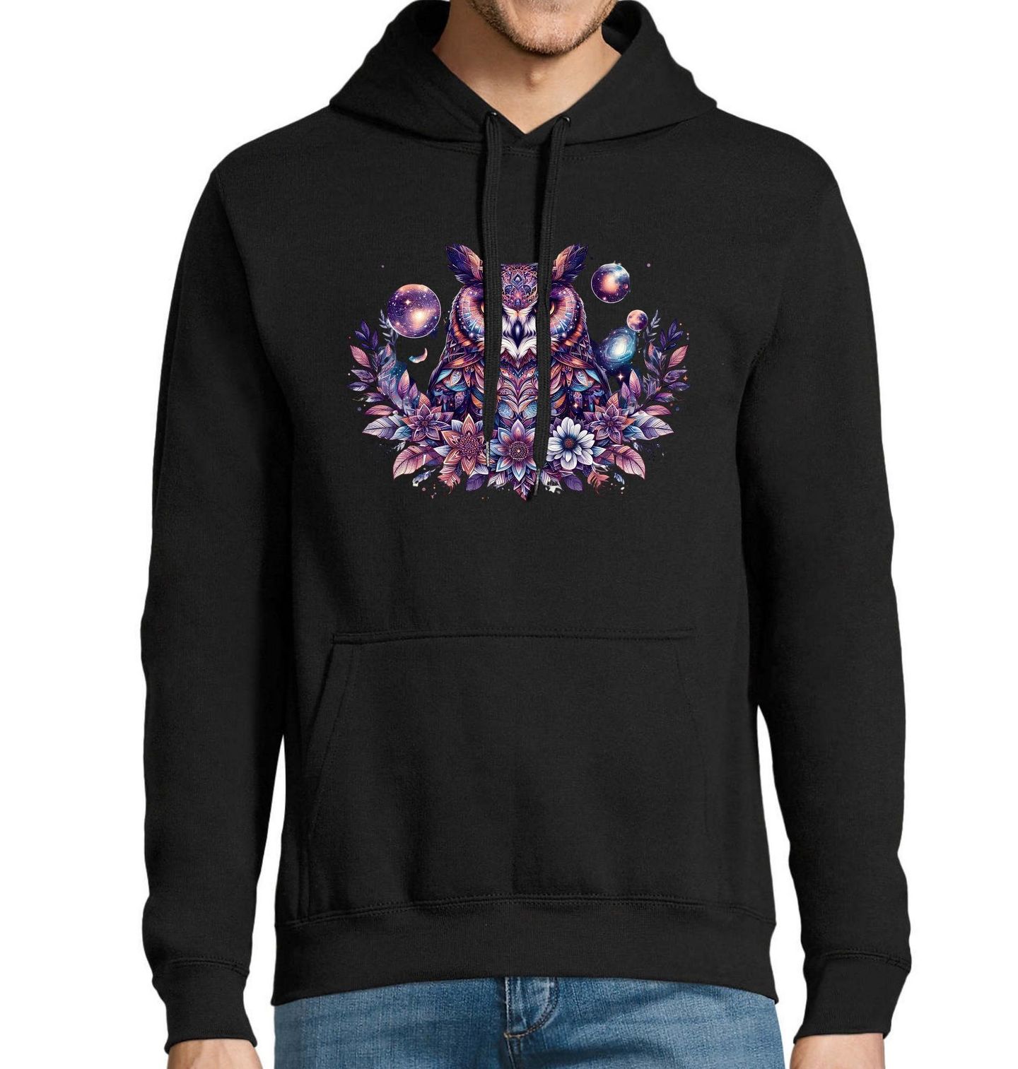 Pánská mikina Mystická Sova Boho. Tričko s jedinečným boho motivem sova, les, květiny vyzařuje harmonii přírody, duchovna a volnosti. Sova s ornamentálním peřím sedící uprostřed barevných květin a tajemného lesa odráží sílu intuice a propojení s přírodou.