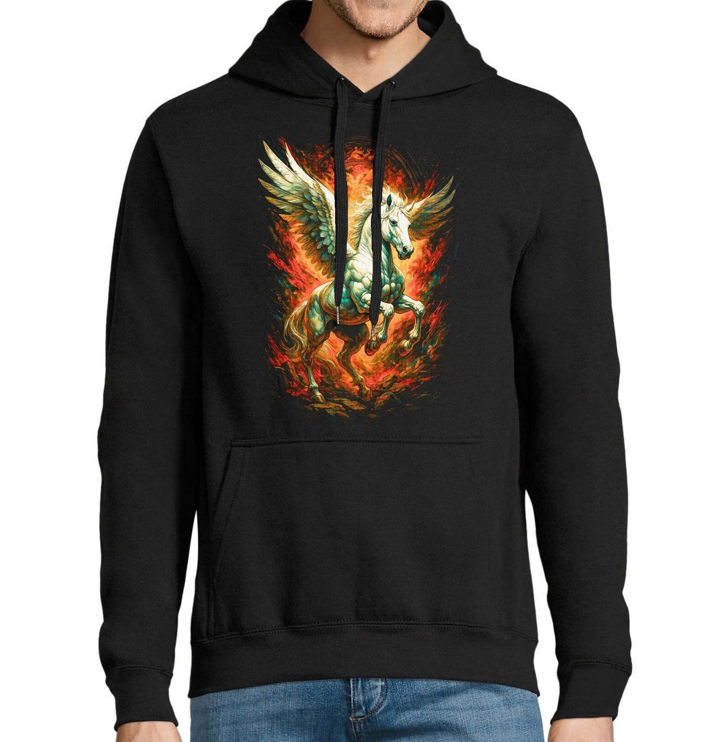 Pánská mikina Mýtický Kůň Pegasus. Pegas je v řecké mytologii okřídlený kůň, syn boha moří Poseidóna a Medúsy. Řecká mytologie jej popisuje jako okřídleného koně zrozeného z krve Medúsy, který se stal symbolem svobody, odvahy a duchovní inspirace. Pegasos představuje překonání hranic a odvahu vzlétnout výš, než je běžné.