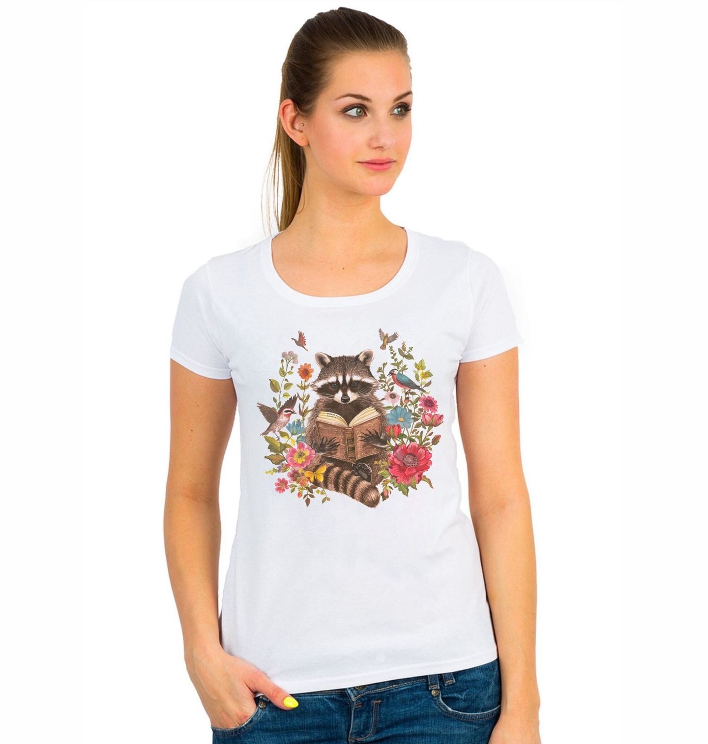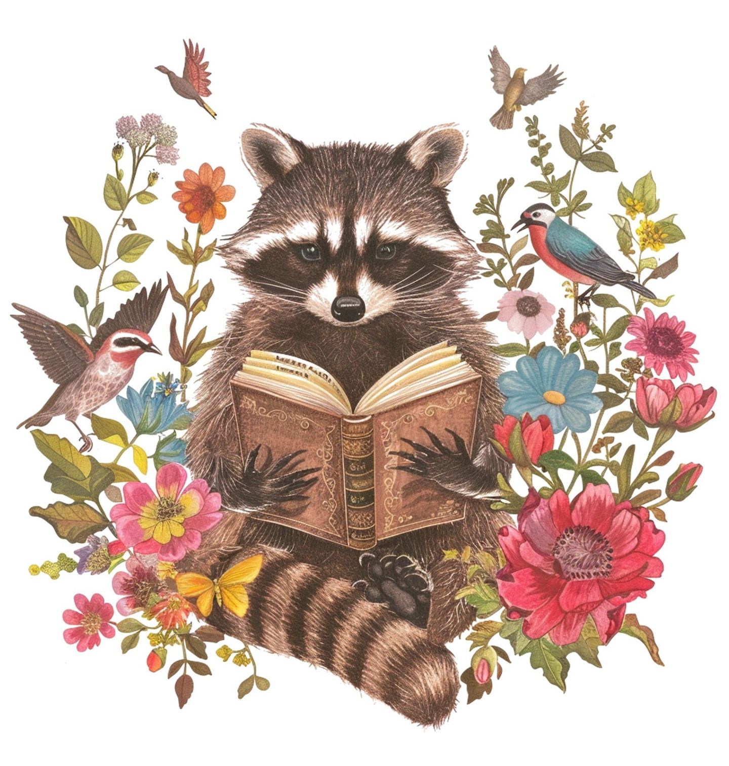 Dámské tričko Mýval v Květinové Knihovně. Roztomilý motiv, kde mýval sedí obklopený pestrými květinami a jemnými detaily přírody, zatímco v tlapkách drží otevřenou knihu. Celou scénu doplňují barevní ptáčci, kteří dodávají ilustraci lehkost a hravou atmosféru. Tento design propojuje klid čtení s krásou přírody – mýval, kniha, květiny i ptáčci tvoří harmonický celek, který potěší každého milovníka zvířat i knih.