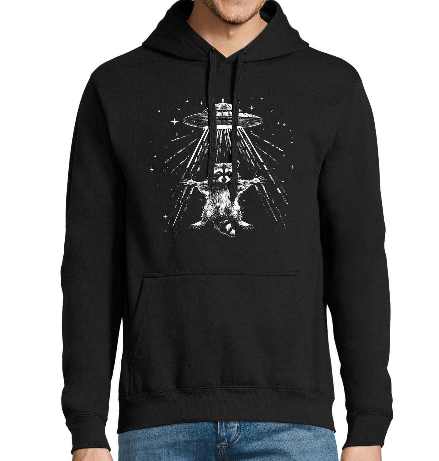 Pánská mikina Mýval v Zajetí Mimozemšťanů UFO. Vtipný a originální motiv zachycuje okamžik, kdy mýval zažívá nečekané dobrodružství s UFO a záhadným světem mimozemšťanů. Hravá ilustrace spojuje humor s lehkým sci-fi nádechem, kde mýval stojí v paprsku světla a ocitá se mezi dvěma světy – zemským a neznámým vesmírem.