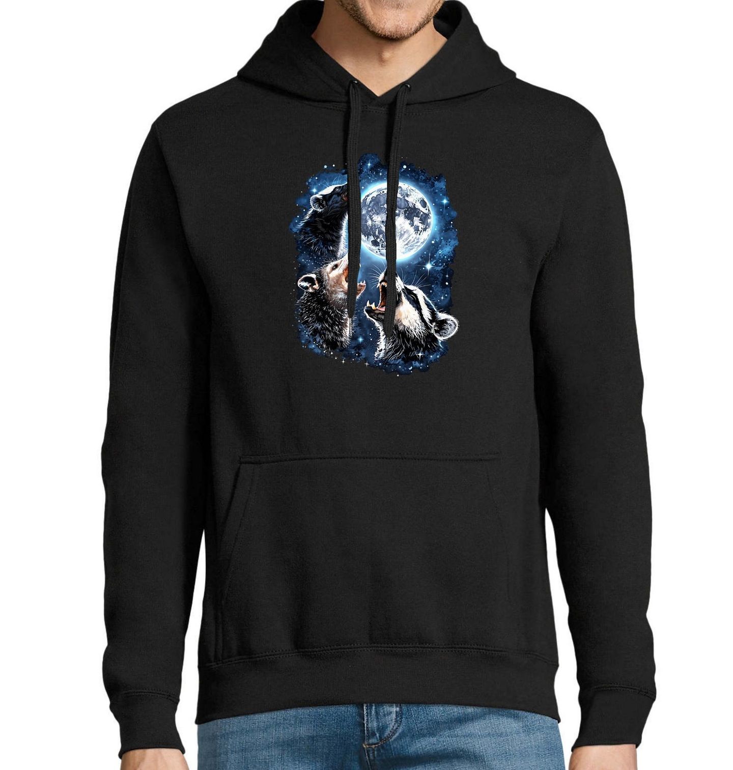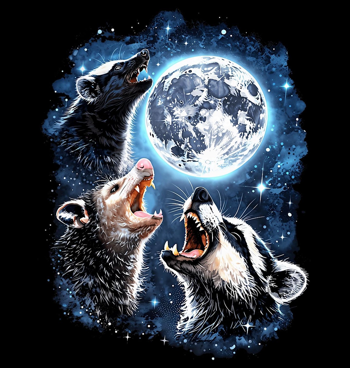 Pánská mikina Mýval, Vačice a Jezevec vyjící na Měsíc. Motiv zachycuje tři divoké tvory, kteří „vyjí“ k zářícímu úplňku. Uprostřed obrazu dominuje jasně svítící měsíc, kolem kterého se dramaticky sklánějí tři zvířata. Celý motiv je stylizovaný do mystické, lehce fantasy atmosféry, která připomíná legendární „Three Wolves and Moon“ styl — jen v mnohem zábavnějším a originálnějším pojetí.