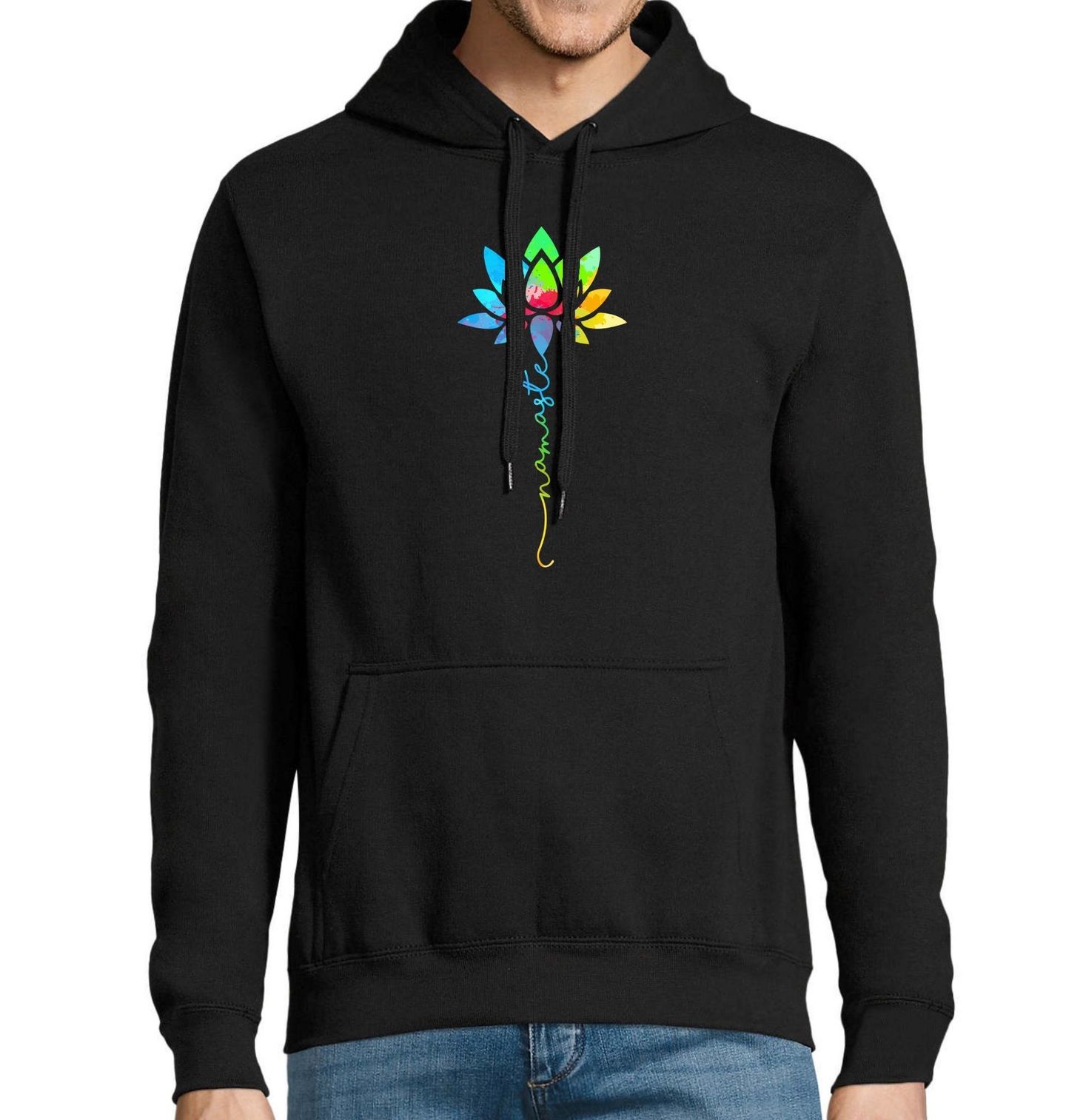 Pánská mikina Namaste Lotusový Květ. Elegantní a barevný motiv namaste v podobě duhového lotosového květu symbolizuje klid, respekt, harmonii a propojení duší. Slovo namaste je jemně zakomponované do stonku lotosu a vyzařuje pozitivní energii má meditace, budha filozofie a jóga.