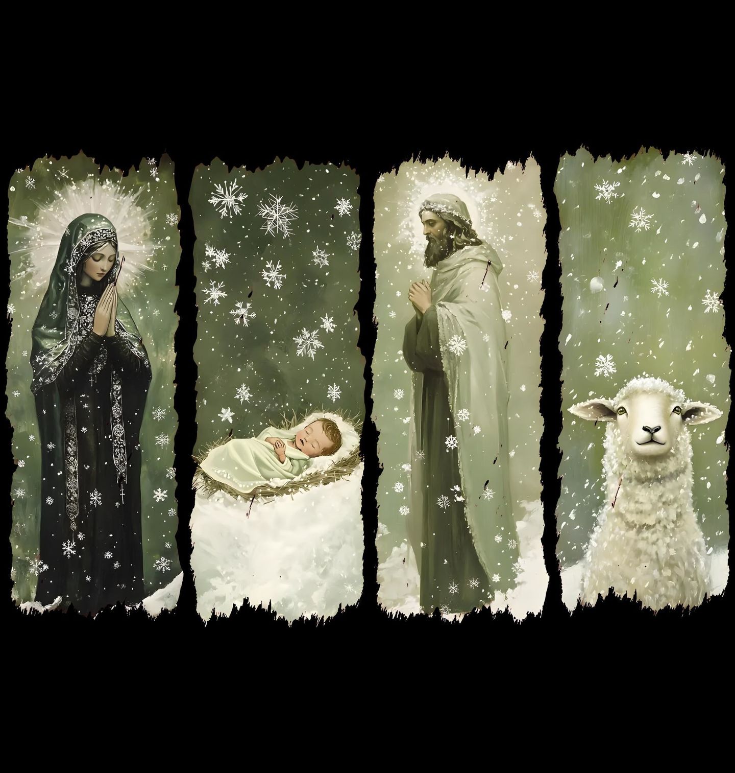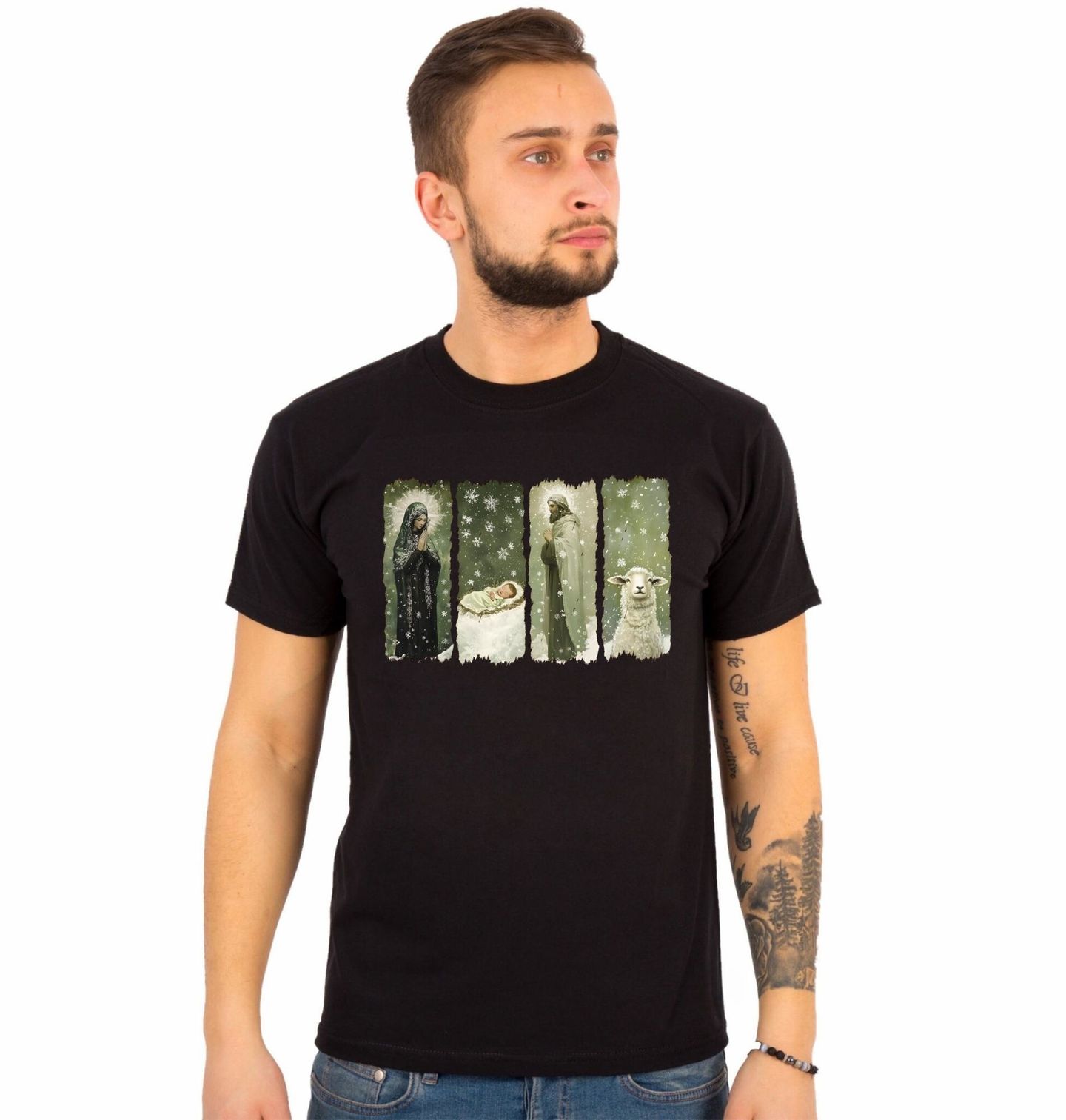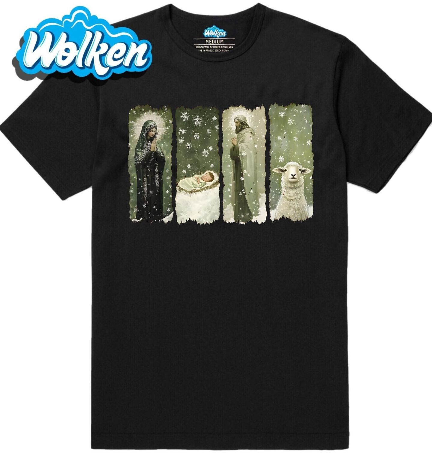 Pánské tričko Narození Ježíše. Krásný vánoční motiv zpracovaný jako čtyřdílný polyptych, který zachycuje posvátný okamžik narození Ježíše. Zobrazení svaté rodiny – Marie, Josefa, malého Ježíše a beránka – podtrhuje poselství víry, naděje a lásky, které jsou s Vánocemi neodmyslitelně spjaty. Ideální design pro všechny, kdo vnímají Vánoce jako svátky narození Ježíše.