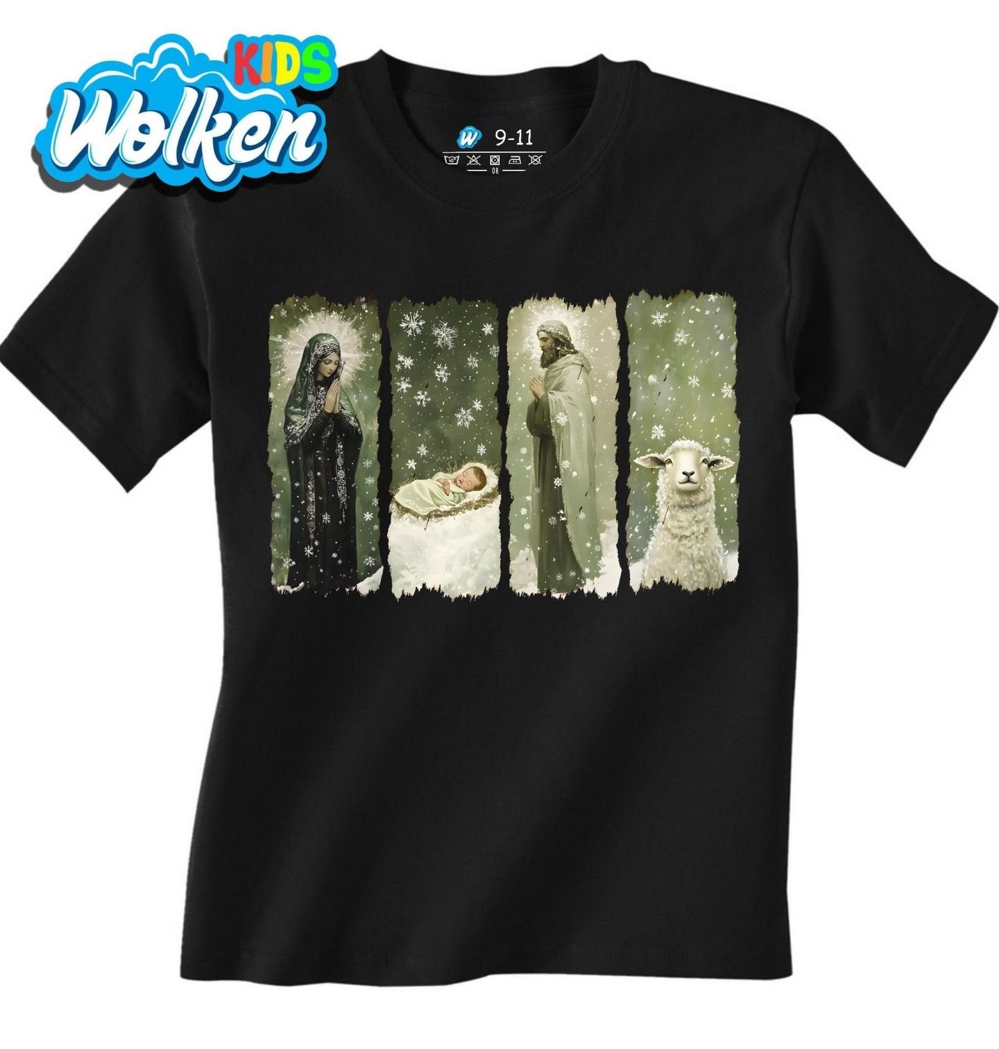 Dětské tričko Narození Ježíše. Krásný vánoční motiv zpracovaný jako čtyřdílný polyptych, který zachycuje posvátný okamžik narození Ježíše. Zobrazení svaté rodiny – Marie, Josefa, malého Ježíše a beránka – podtrhuje poselství víry, naděje a lásky, které jsou s Vánocemi neodmyslitelně spjaty. Ideální design pro všechny, kdo vnímají Vánoce jako svátky narození Ježíše.