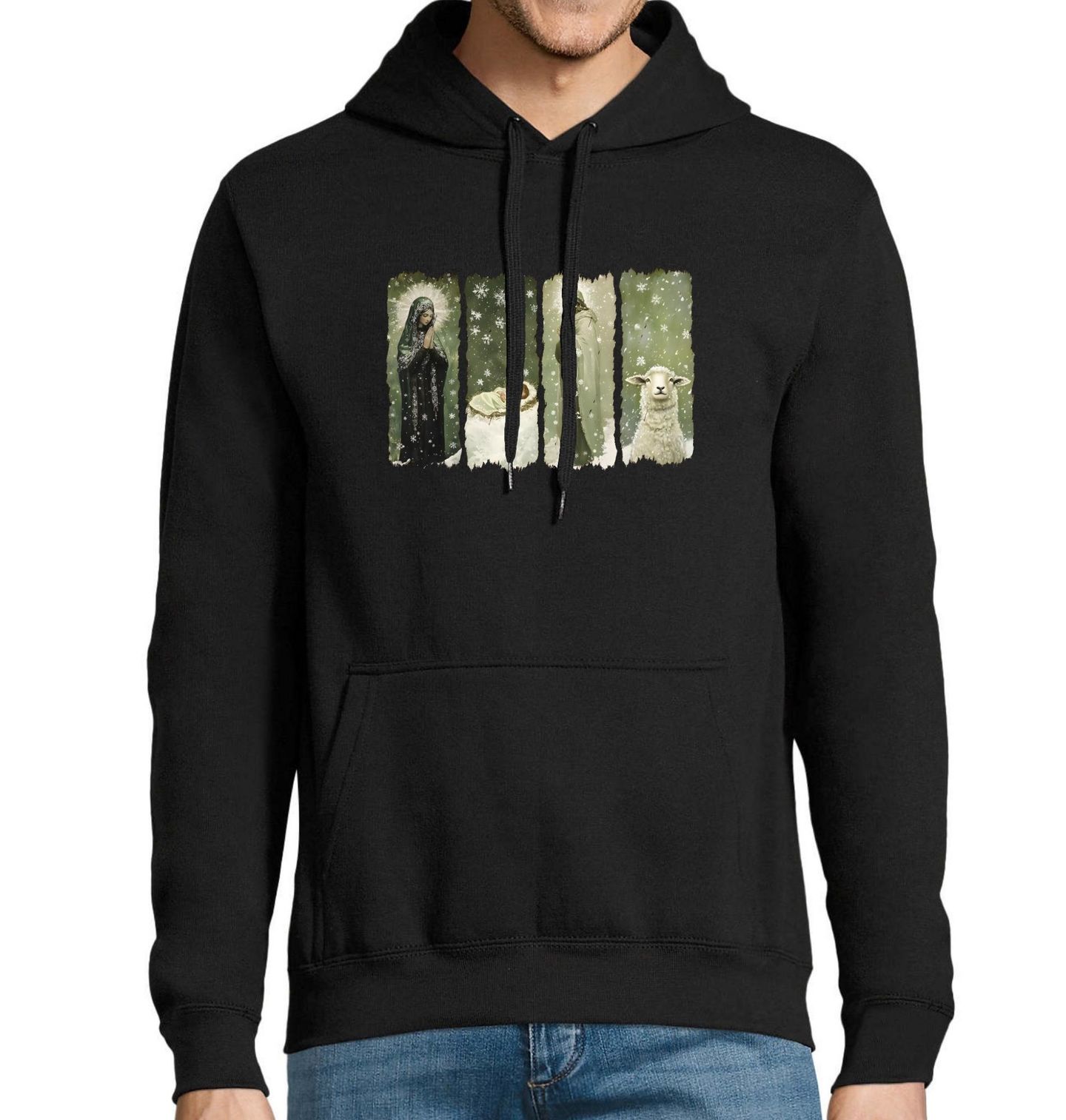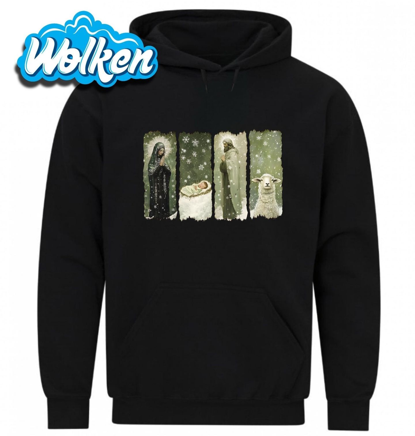 Pánská mikina Narození Ježíše. Krásný vánoční motiv zpracovaný jako čtyřdílný polyptych, který zachycuje posvátný okamžik narození Ježíše. Zobrazení svaté rodiny – Marie, Josefa, malého Ježíše a beránka – podtrhuje poselství víry, naděje a lásky, které jsou s Vánocemi neodmyslitelně spjaty. Ideální design pro všechny, kdo vnímají Vánoce jako svátky narození Ježíše.