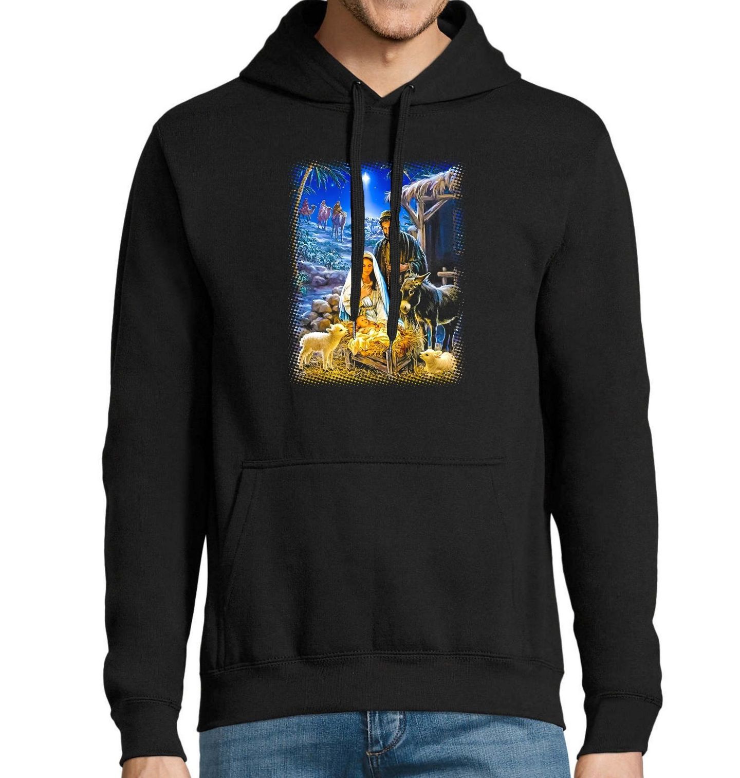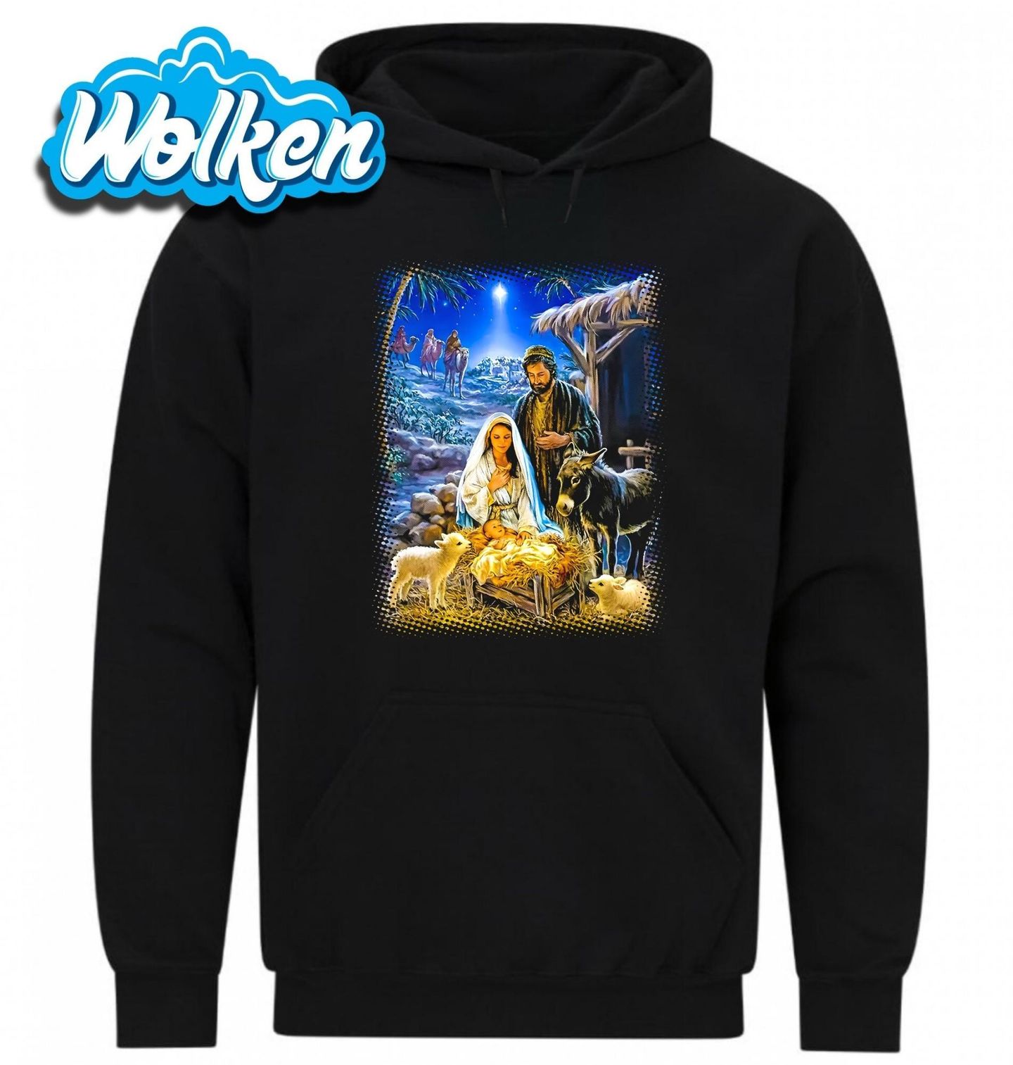 Pánská mikina Narození Spasitele. Tradiční motiv narození Ježíše Krista zachycený v nádherných barvách a jemných detailech. Marie, Josef a malý Ježíšek spočívají ve chlévě obklopeni světlem betlémské hvězdy, zvířaty a pokornou atmosférou klidu. Motiv si zamilují milovníci křesťanských motivů a vánoční symboliky.