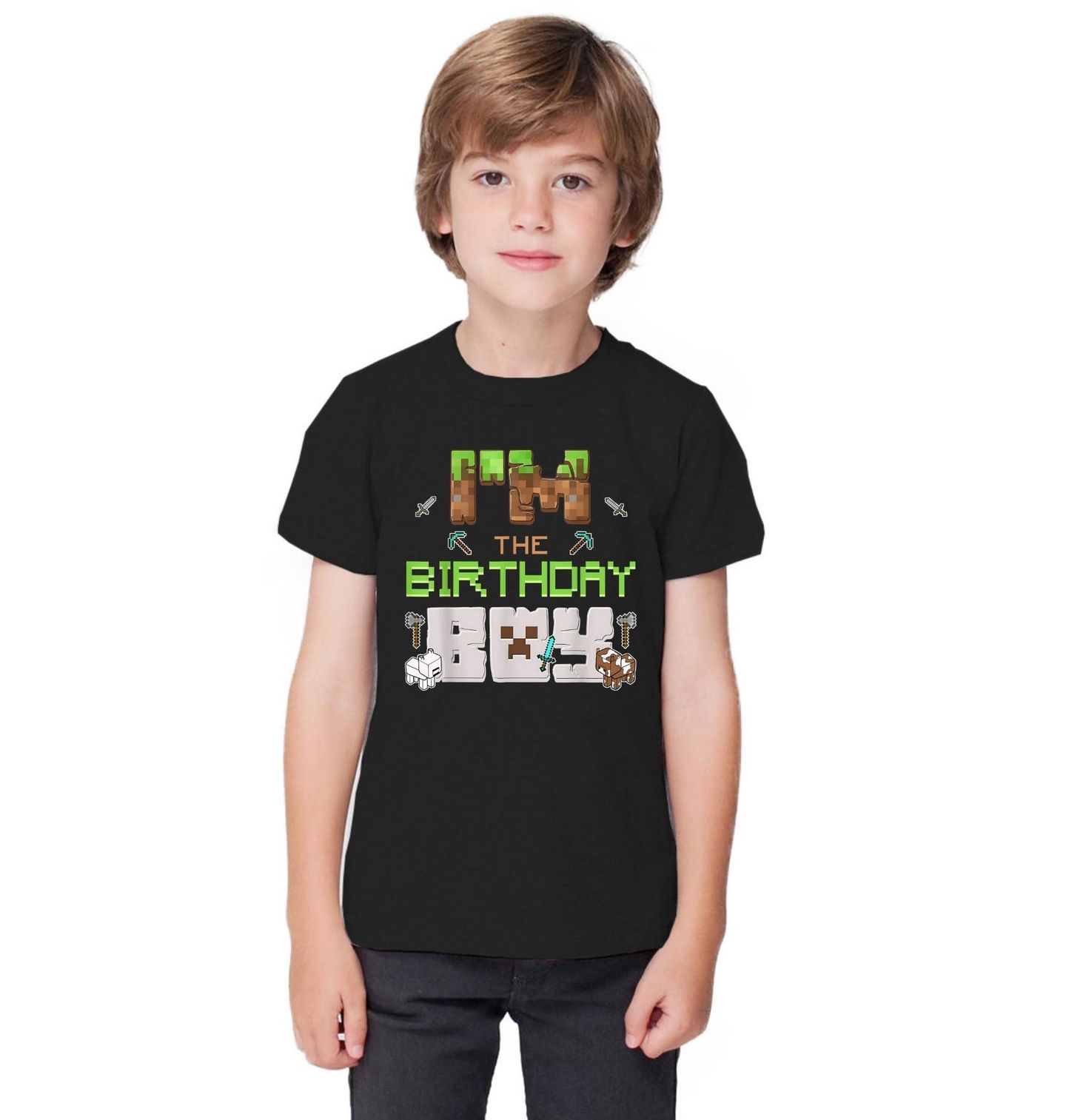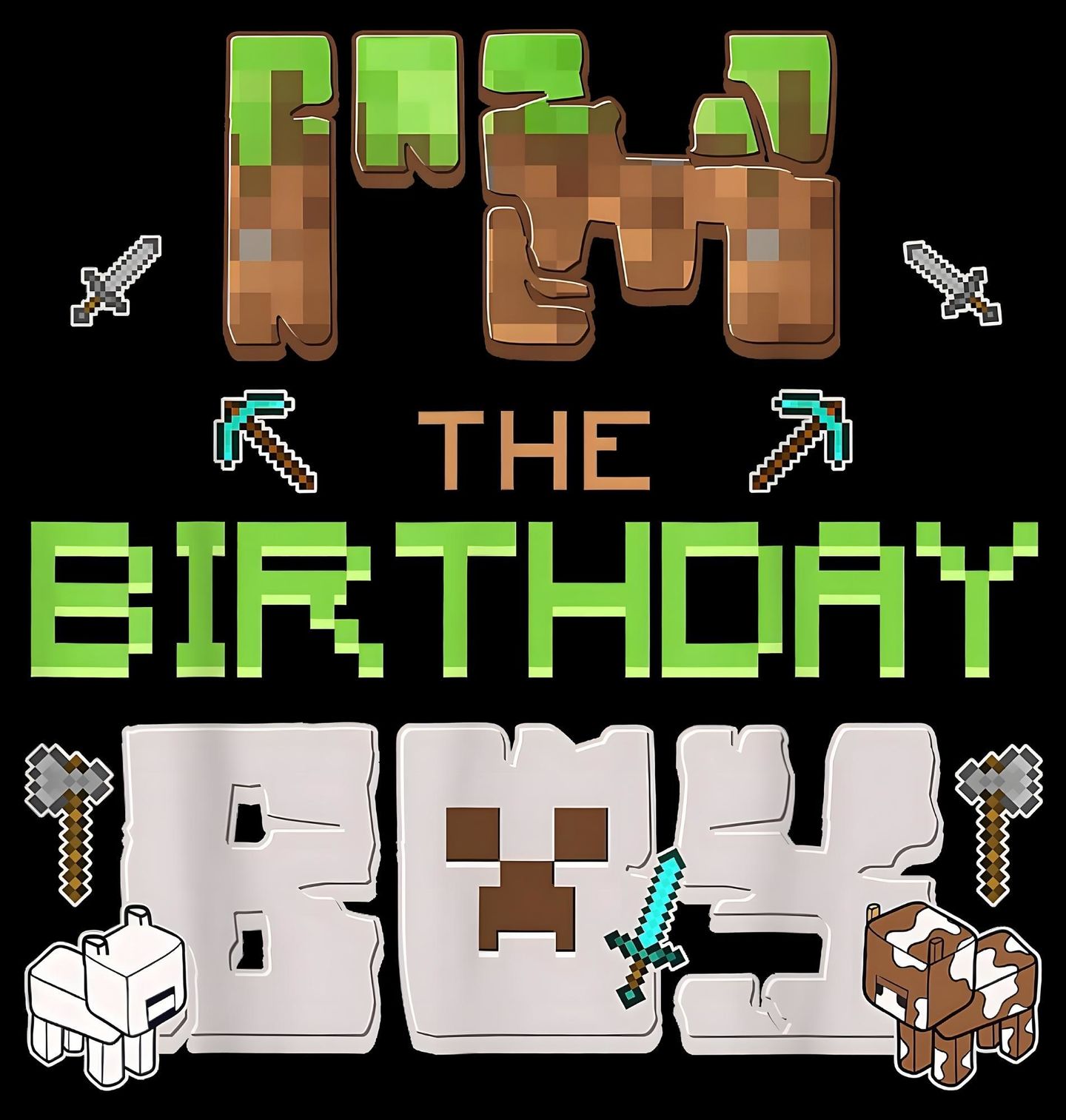 Dětské tričko Narozeninový hráč Minecraftu. Minecraft narozeninový motiv pro každého malého hráče! Tento design s nápisem „I’m the Birthday Boy“ je jako stvořený pro gamera a fanouška světa Minecraft. Pixelová písmena, ikonické předměty (meč, krumpáč, mobové) a styl inspirovaný hrou vytvoří nezapomenutelnou narozeninovou atmosféru.
