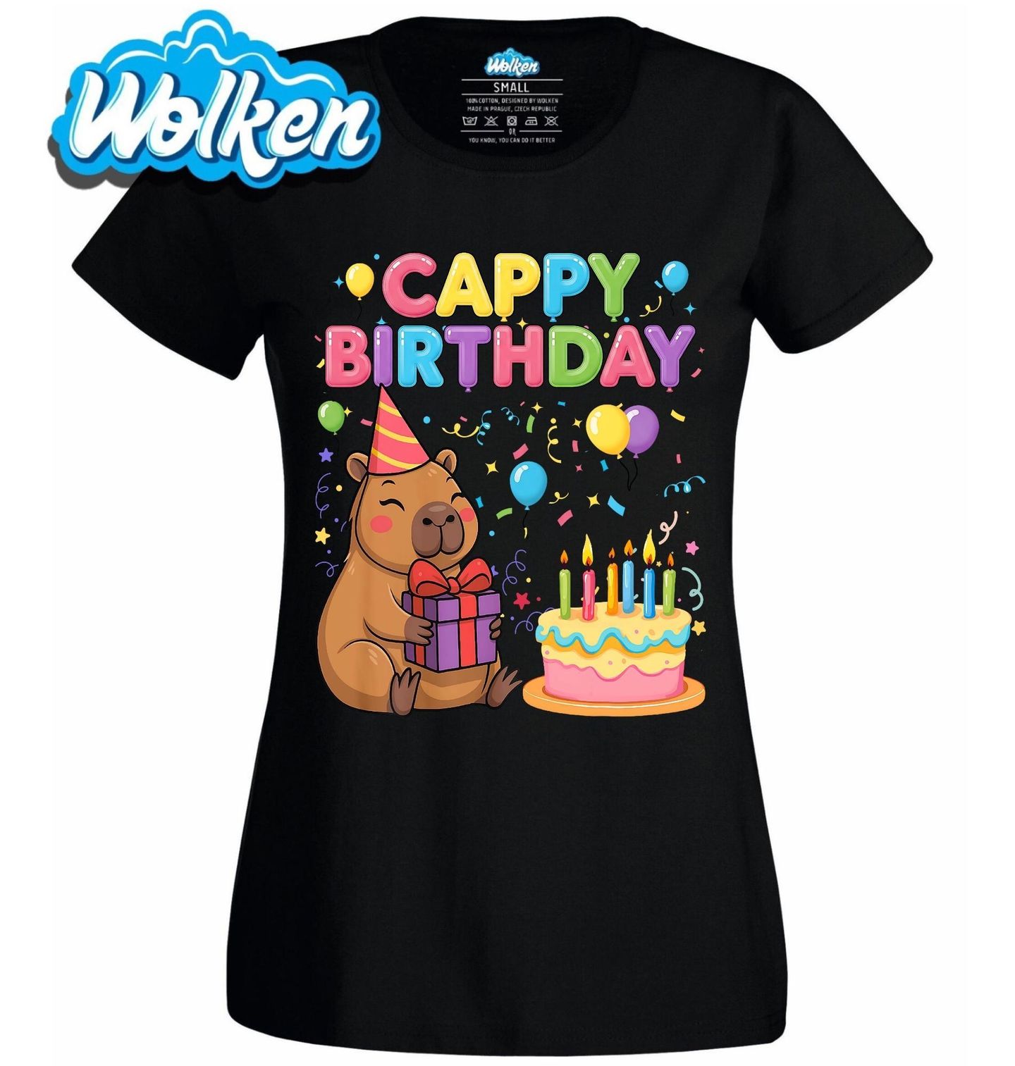 Dámské tričko Narozeniny s Kapybarou Cappy Birthday. Roztomilá kapybara v párty čepičce, dort se svíčkami, konfety, balónky a nápis „Cappy Birthday“ – tohle je ideální narozeninový motiv pro milovníky nejklidnějšího zvířete na světě! Perfektní dárek k narozeninám pro děti i dospělé, fanoušky kapybar nebo ty, kteří milují originální zvířecí motivy. Tenhle design rozzáří každou oslavu!