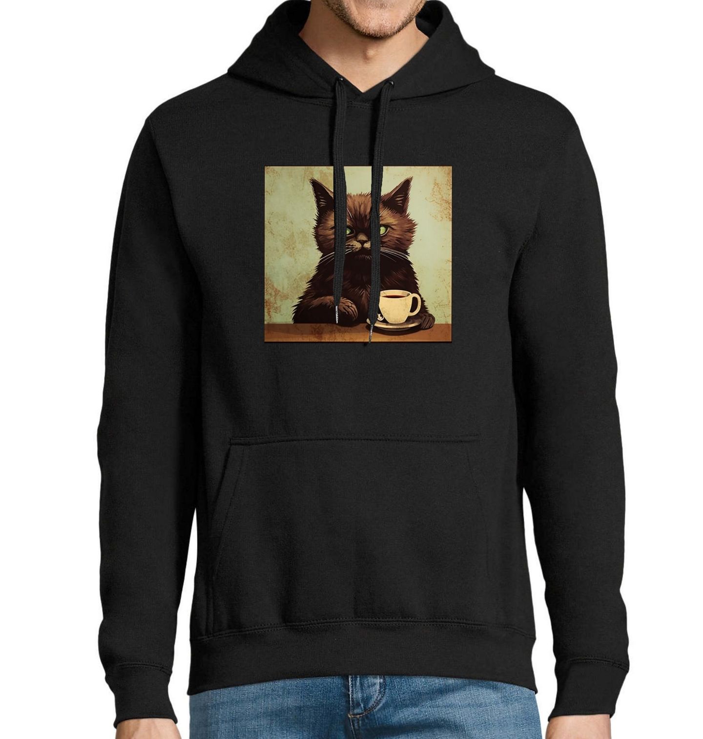Pánská mikina Naštvaná Kočka před Ranní Kávou. Tričko s originálním motivem naštvané kočky a šálku kávy je ideální volbou pro každého milovníka sarkasmu, kofeinu a koček. Tato ilustrace perfektně vystihuje ten známý ranní výraz, než přijde první doušek a káva vás probudí – ať už jste člověk nebo kočka.