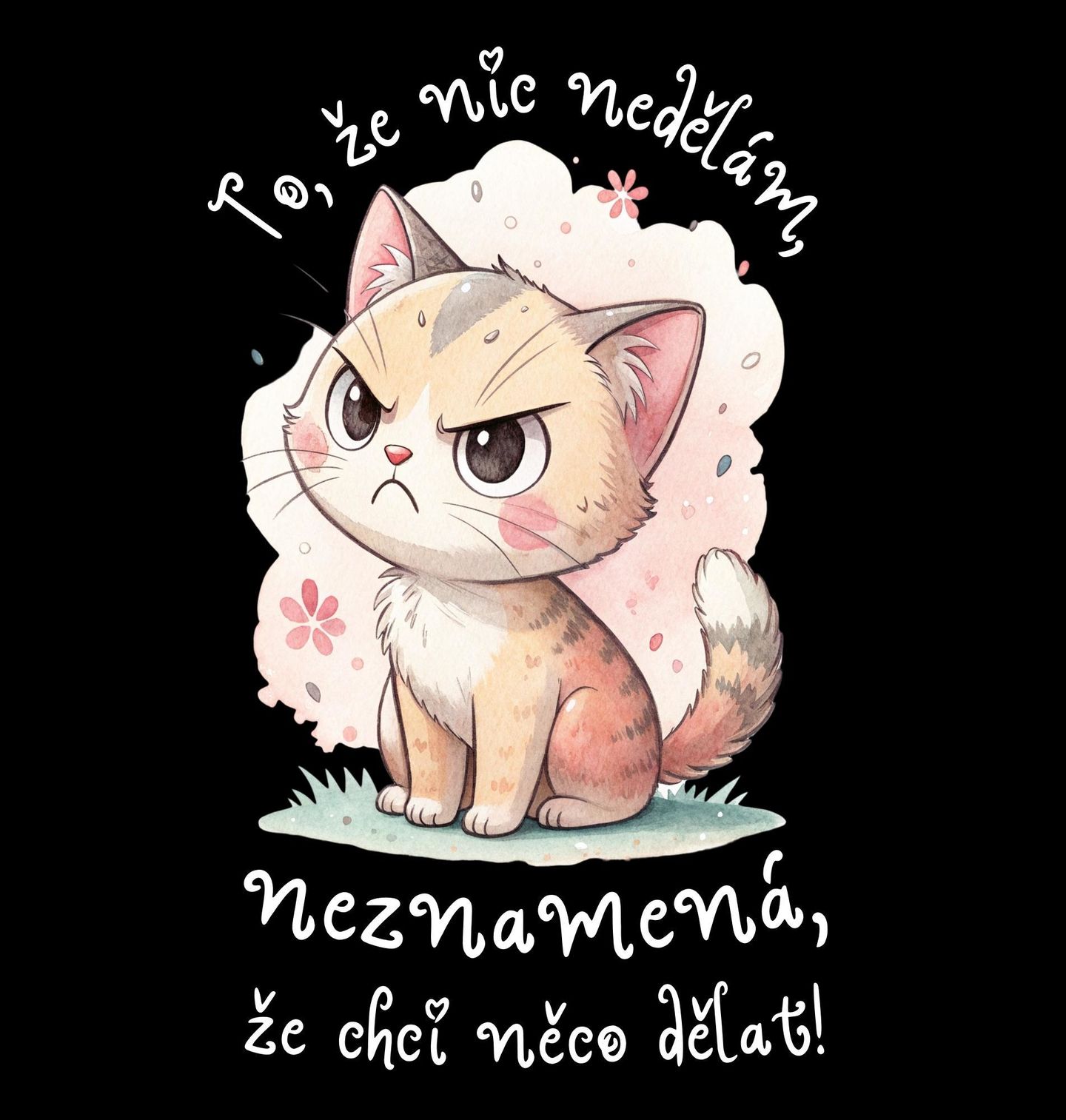 Dámské tričko Naštvaná Kočka To, že nic nedělám, neznamená, že chci něco dělat! Roztomilá, ale pořádně naštvaná kočka s nápisem „To, že nic nedělám, neznamená, že chci něco dělat!“ – přesně pro všechny, kteří si chtějí chránit svůj klid a pohodlí. Tento motiv s kočkou dokonale vystihuje lenošení, pohodlí a lehce pasivně-agresivní humor.
