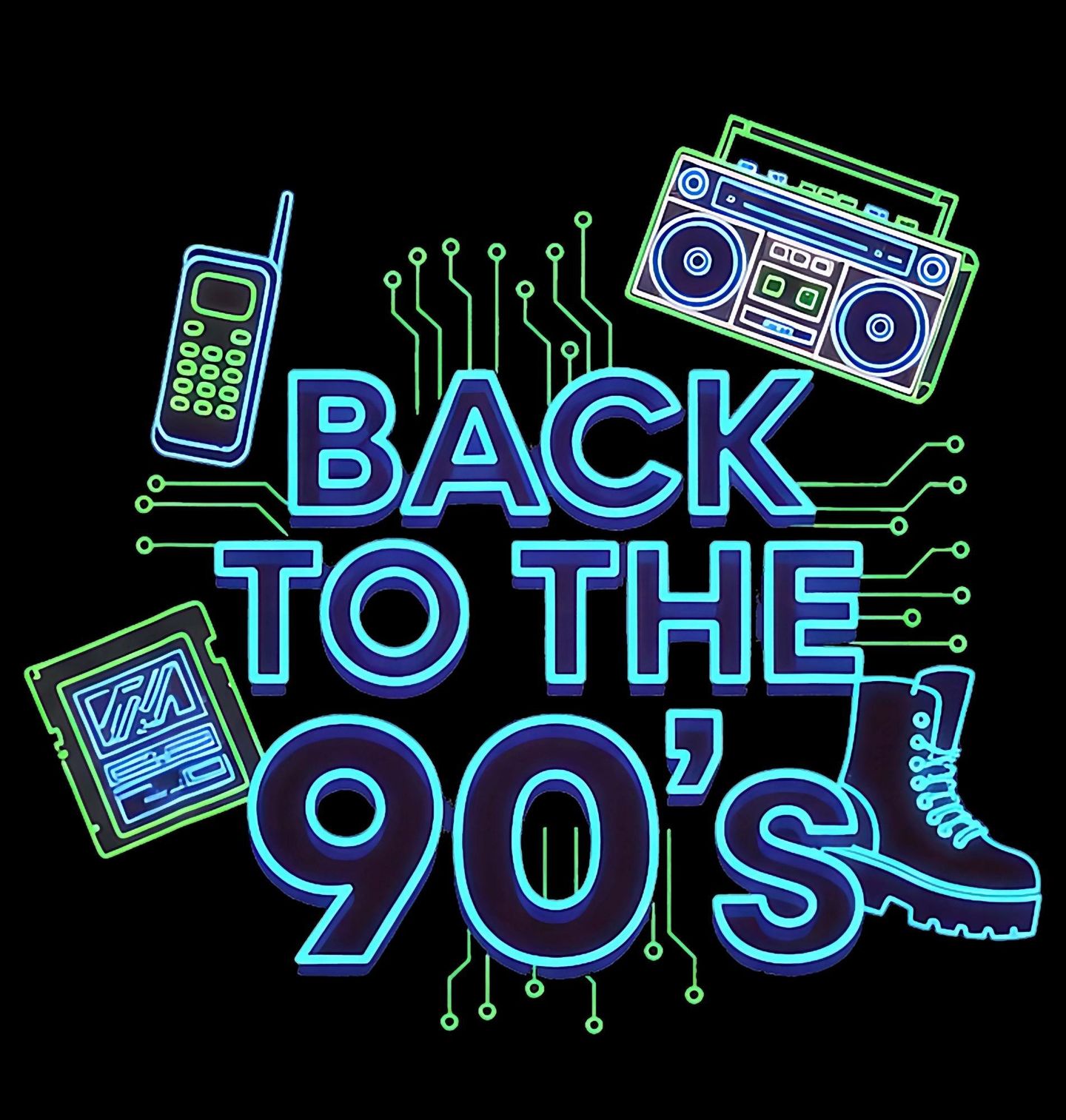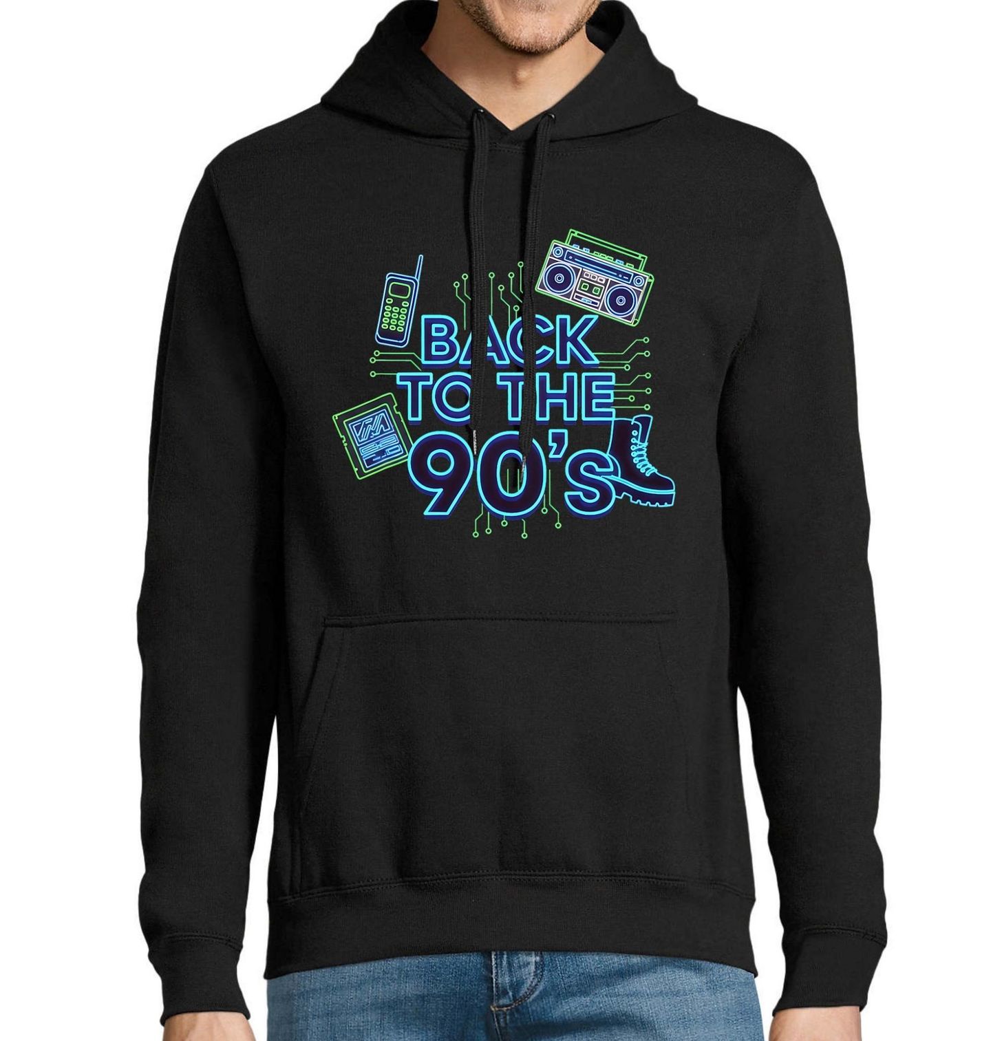 Pánská mikina Návrat do Devadesátek. Barevný motiv s nápisem „Back to the 90’s“ (Zpět do 90. let) přináší nostalgii ikonické éry. Retro prvky jako kazeta, telefon a rádio evokují nezapomenutelnou atmosféru devadesátek. Vhodné pro každého milovníka tohoto období.