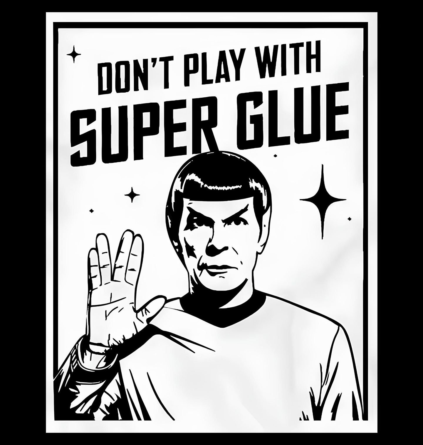 Pánské tričko Nehraj si se Sekundovým Lepidlem Star Trek. „DON’T PLAY WITH SUPER GLUE“. Je to parodie na postavu Spock ze seriálu Star Trek. Tady je to použité vtipně – místo slavného „Live long and prosper“ je tam varování „Don’t play with super glue“, což dělá z vážné sci-fi ikony humorný plakát.