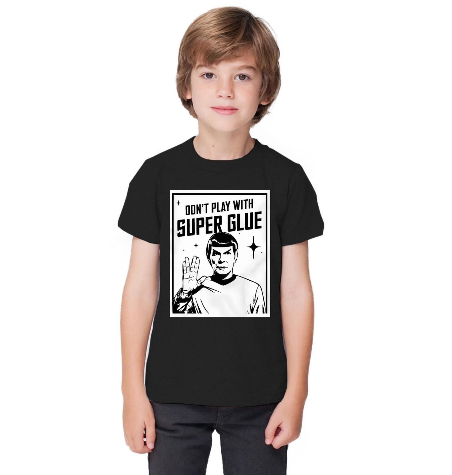 Dětské tričko Nehraj si se Sekundovým Lepidlem Star Trek. „DON’T PLAY WITH SUPER GLUE“. Je to parodie na postavu Spock ze seriálu Star Trek. Tady je to použité vtipně – místo slavného „Live long and prosper“ je tam varování „Don’t play with super glue“, což dělá z vážné sci-fi ikony humorný plakát.
