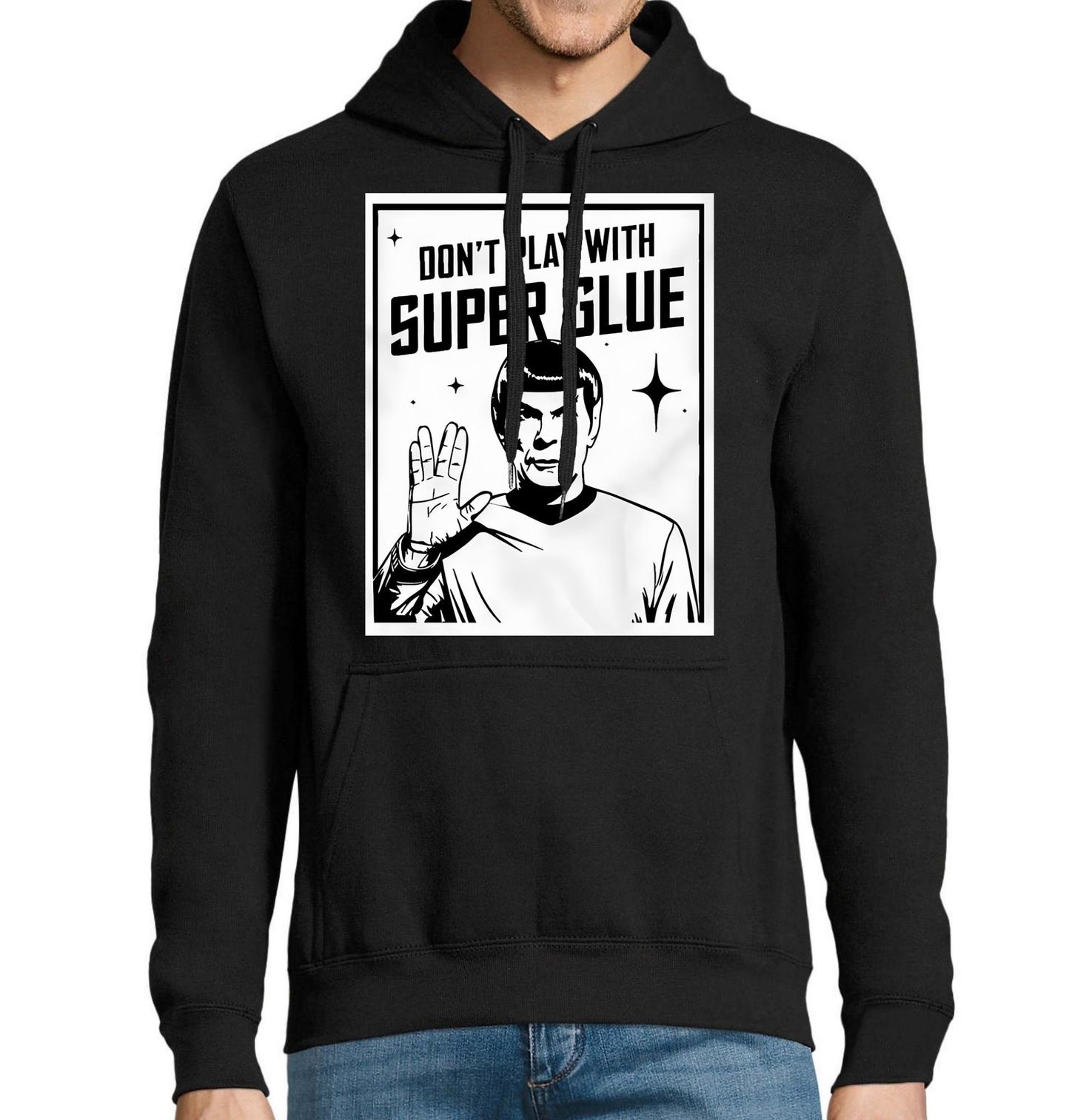 Pánská mikina Nehraj si se Sekundovým Lepidlem Star Trek. „DON’T PLAY WITH SUPER GLUE“. Je to parodie na postavu Spock ze seriálu Star Trek. Tady je to použité vtipně – místo slavného „Live long and prosper“ je tam varování „Don’t play with super glue“, což dělá z vážné sci-fi ikony humorný plakát.