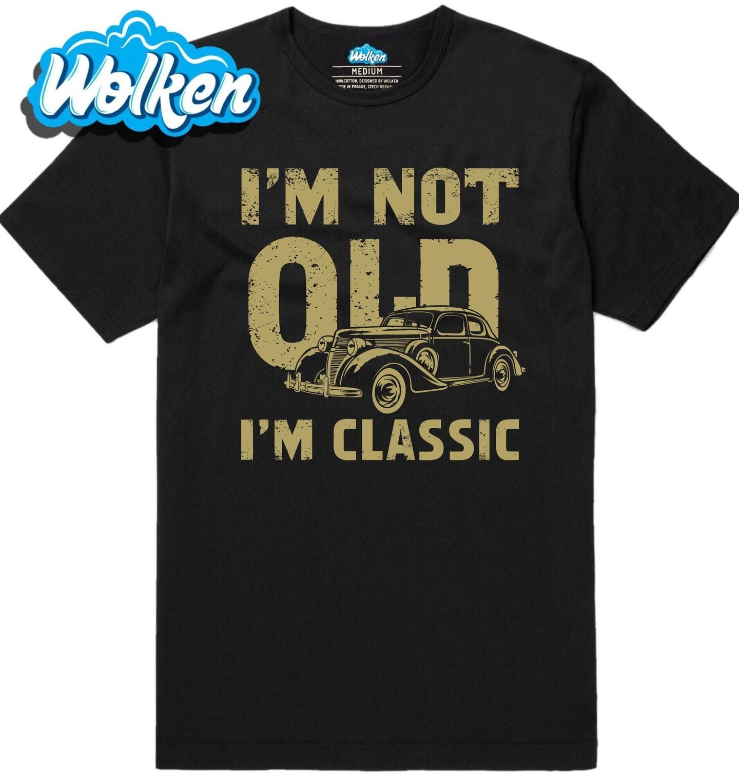 Pánské tričko Nejsem starý auto, jsem klasika. Vtipný motiv s retro autem a nápisem „I'm not old, I'm classic“ (v překladu „Nejsem starý, jsem klasika“) je ideální pro všechny milovníky veteránů, starých dobrých časů a pořádných aut. Skvělý dárek pro každého, kdo má rád auta a nebere věk moc vážně.