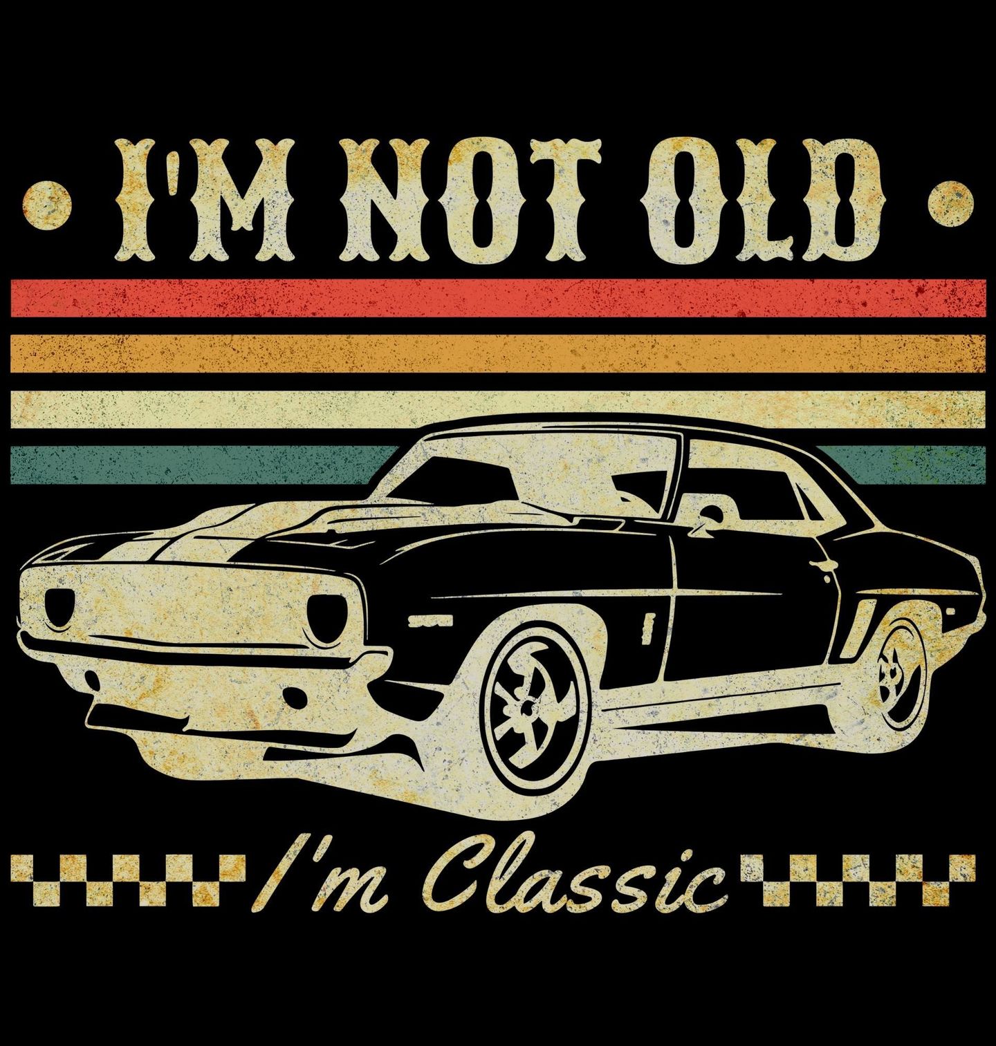 Dámské tričko Nejsem Starý jsem Klasika. Retro motiv s klasickým americkým sportovním autem v vintage stylu a barevným pruhem připomínajícím design 70. let. Na obrázku je text "I'm Not Old" a "I'm Classic", což v překladu znamená "Nejsem starý" a "Jsem klasika". Tento design je perfektní pro milovníky historických vozů, veteránů a automobilové kultury.