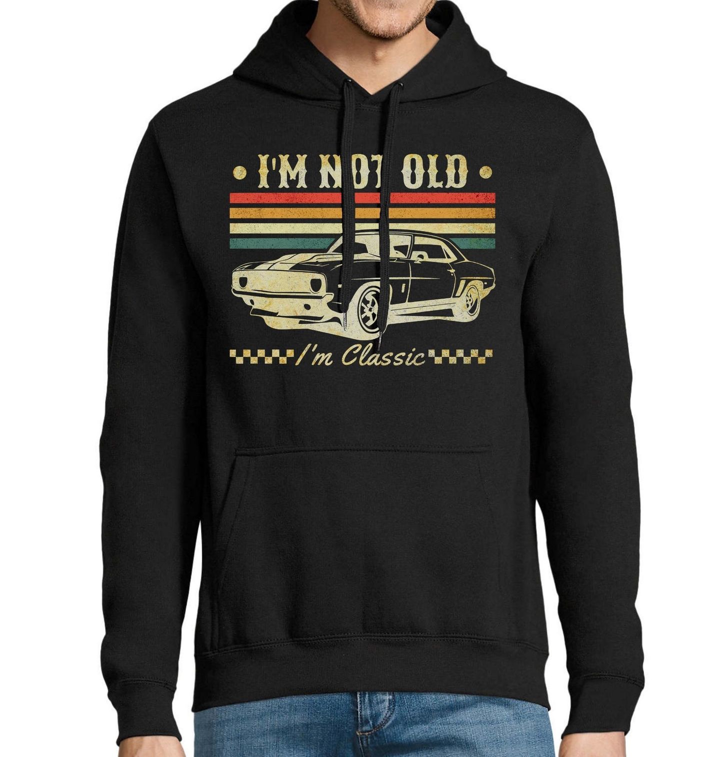 Pánská mikina Nejsem Starý jsem Klasika. Retro motiv s klasickým americkým sportovním autem v vintage stylu a barevným pruhem připomínajícím design 70. let. Na obrázku je text "I'm Not Old" a "I'm Classic", což v překladu znamená "Nejsem starý" a "Jsem klasika". Tento design je perfektní pro milovníky historických vozů, veteránů a automobilové kultury.
