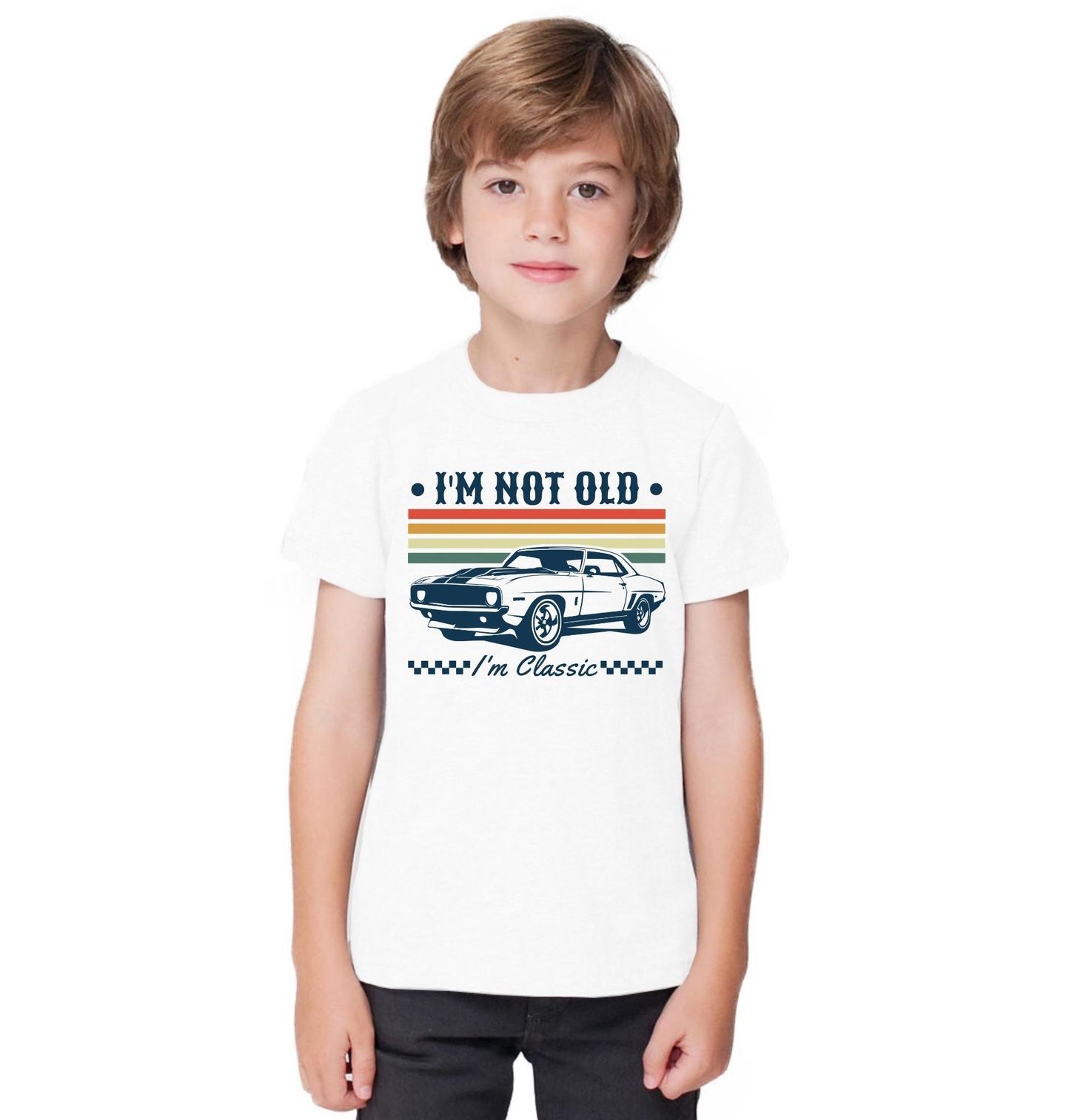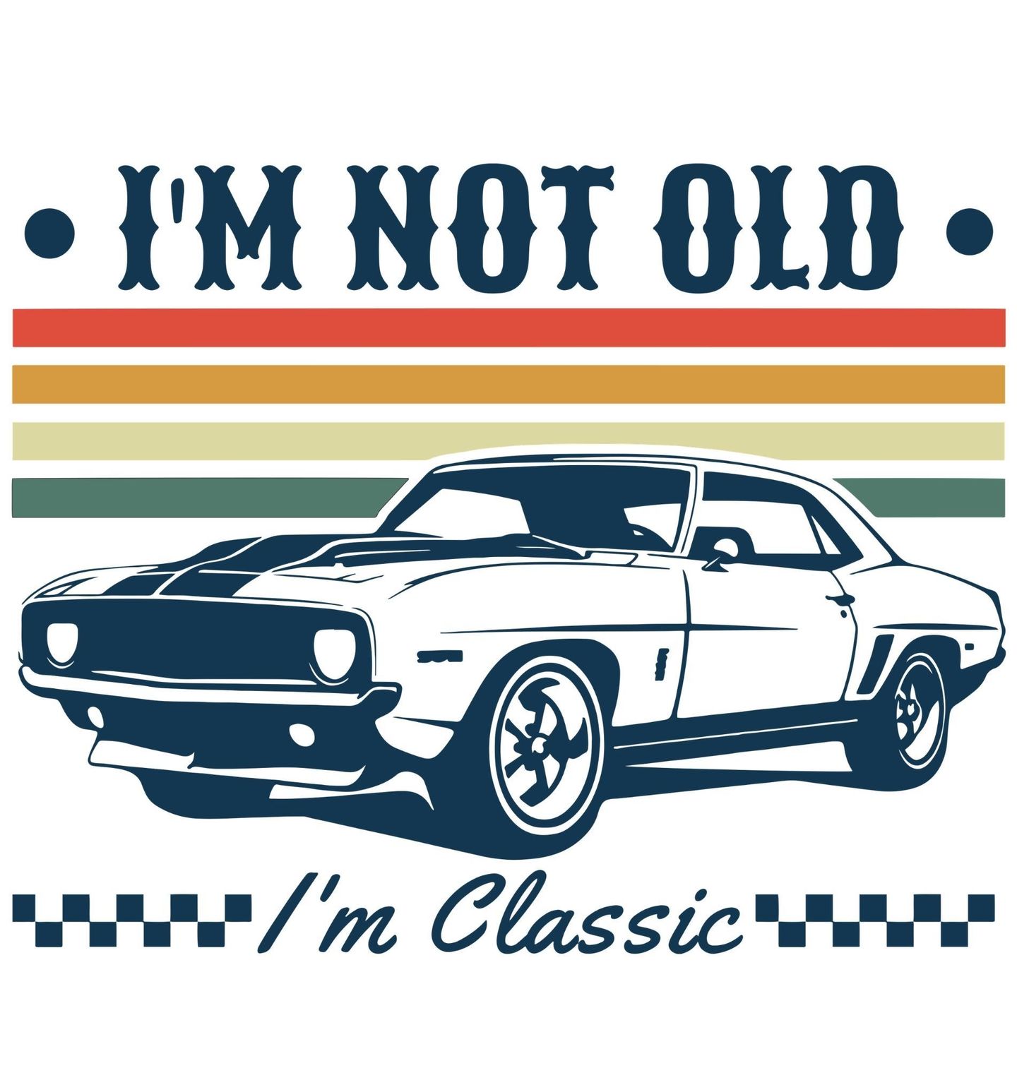 Dětské tričko Nejsem Starý pouze Klasika. Retro design s klasickým americkým muscle carem doplněný barevnými vintage pruhy. Styl připomíná staré závodní plakáty a zdůrazňuje eleganci klasických aut. Text na obrázku: „I’M NOT OLD I’M CLASSIC“ (Nejsem starý, jsem klasika)