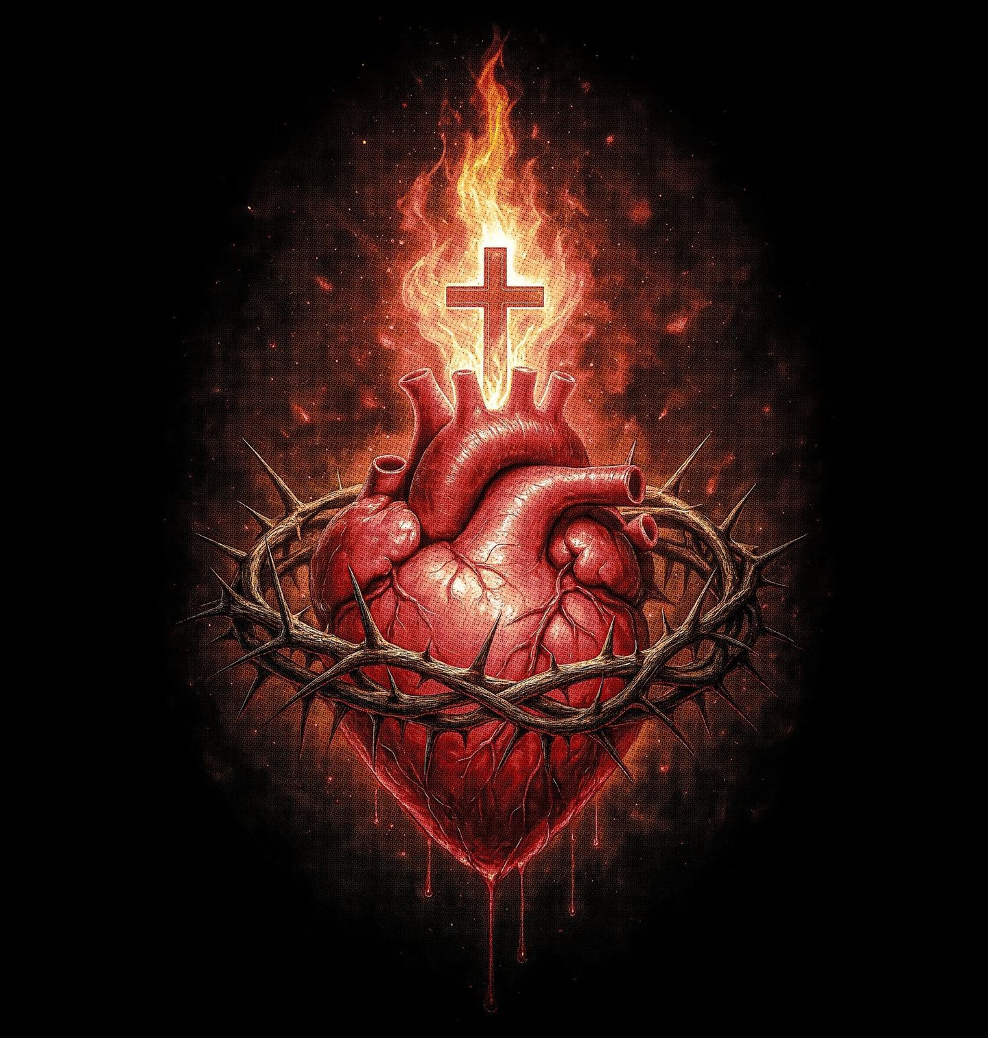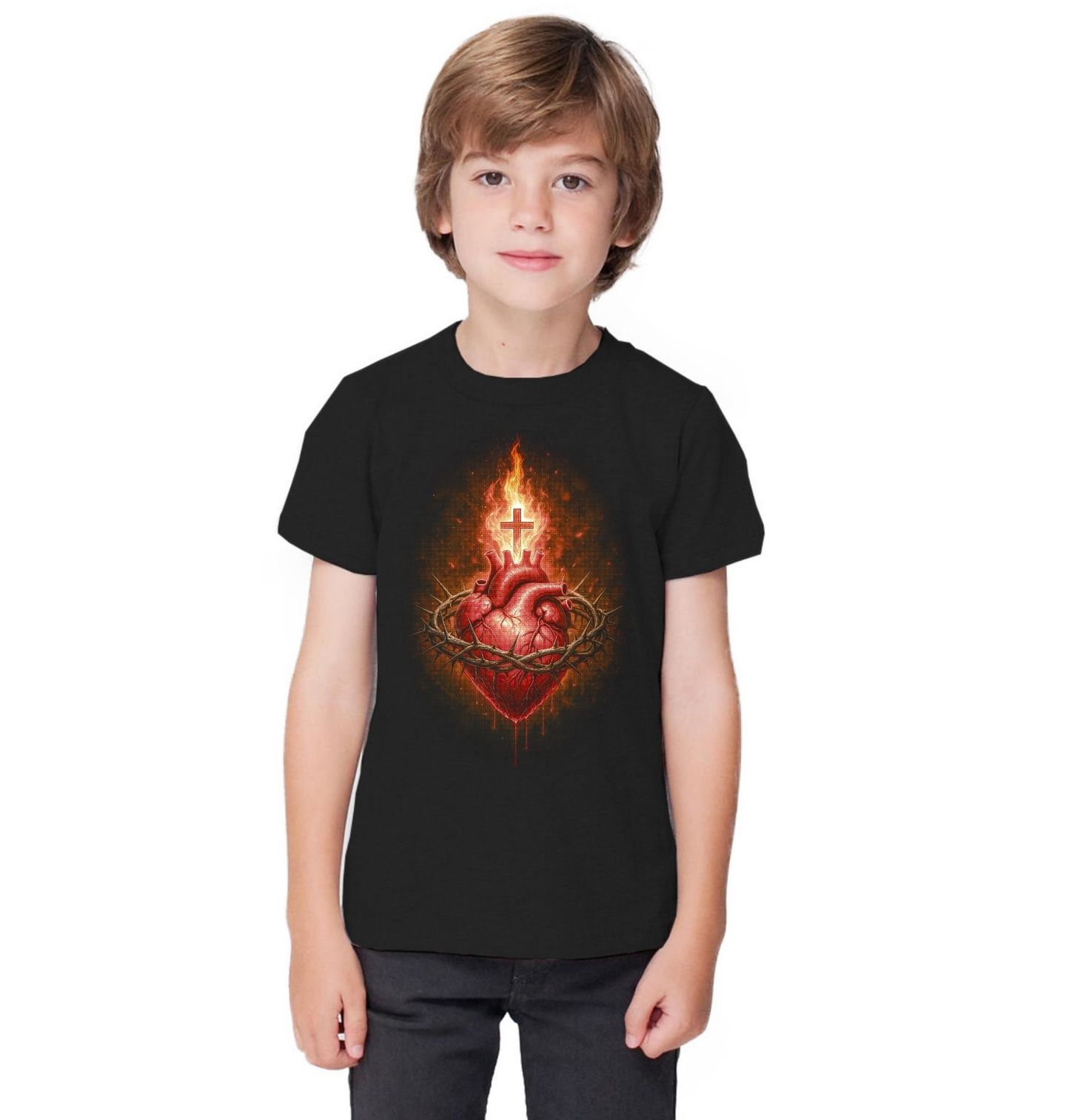 Dětské tričko Nejsvětější Srdce Ježíšovo. Motiv vychází z tradice křesťanství, kde Nejsvětější Srdce představuje nekonečnou Boží lásku k lidstvu. Realisticky ztvárněné srdce, obepnuté trnovou korunou, odkazuje na utrpení Krista, zatímco plamen a kříž vyrůstající z jeho vrcholu symbolizují naději, víru a vítězství nad smrtí.