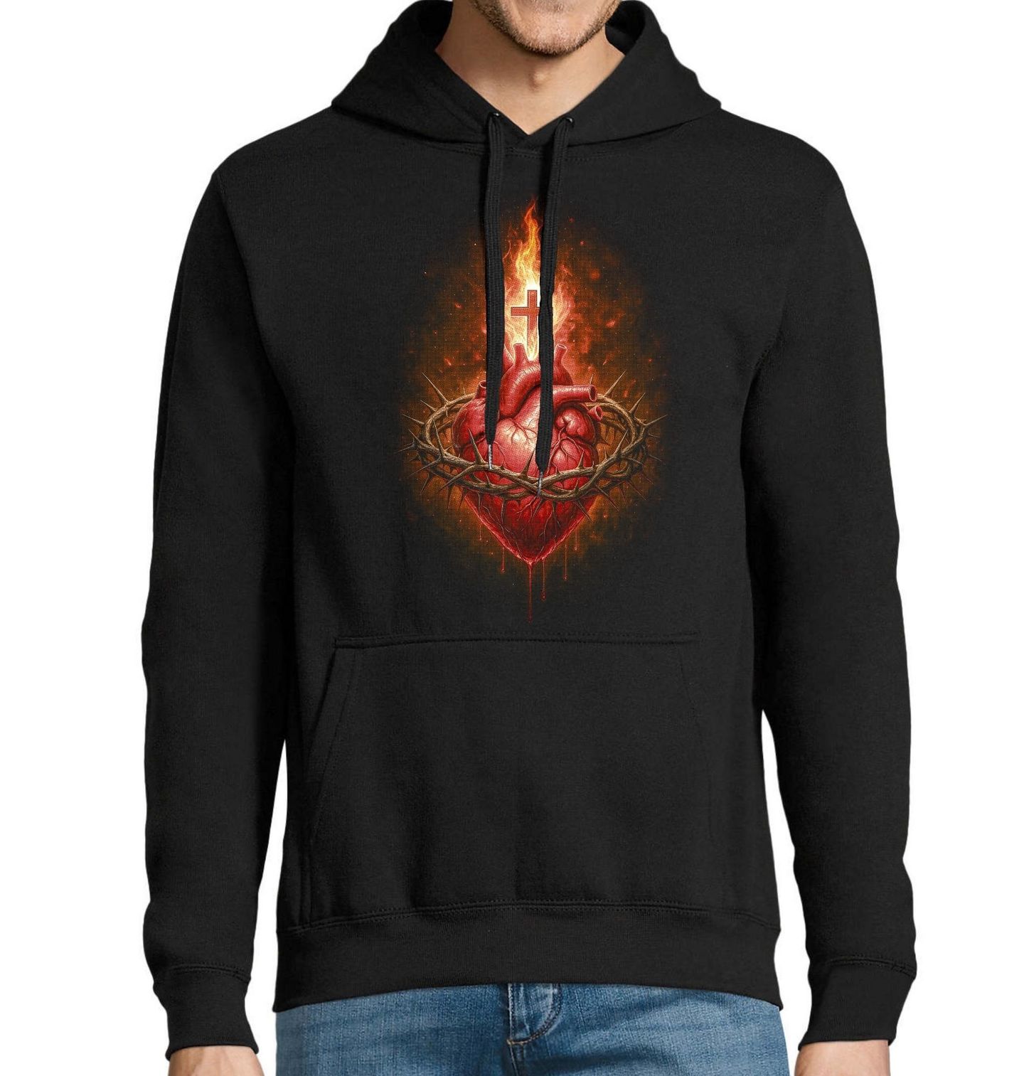 Pánská mikina Nejsvětější Srdce Ježíšovo. Motiv vychází z tradice křesťanství, kde Nejsvětější Srdce představuje nekonečnou Boží lásku k lidstvu. Realisticky ztvárněné srdce, obepnuté trnovou korunou, odkazuje na utrpení Krista, zatímco plamen a kříž vyrůstající z jeho vrcholu symbolizují naději, víru a vítězství nad smrtí.