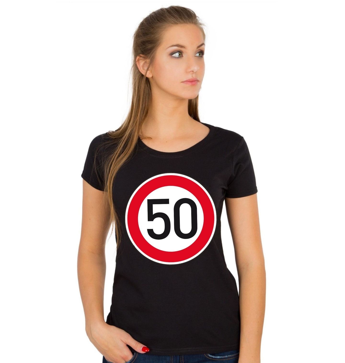 Dámské tričko Nejvyšší dovolená rychlost 50. Design inspirovaný dopravní značkou “Nejvyšší dovolená rychlost” s číslem „50“, která je zobrazena v typickém kruhu s červeným okrajem a bílým středem. Černé číslo 50 dominuje celému motivu a symbolizuje rychlostní limit, věk nebo milník. Vhodný dárek pro oslavence k padesátinám.